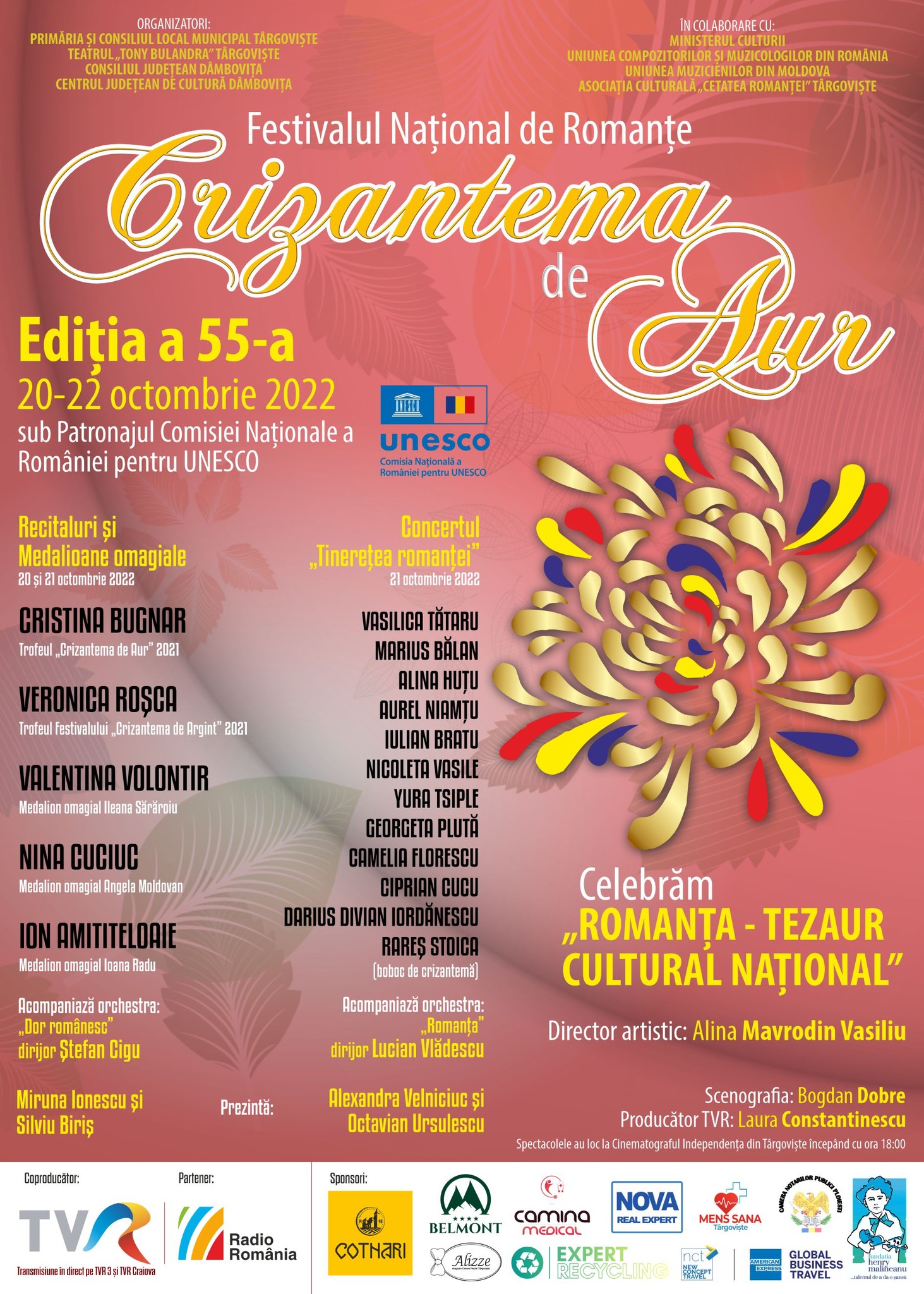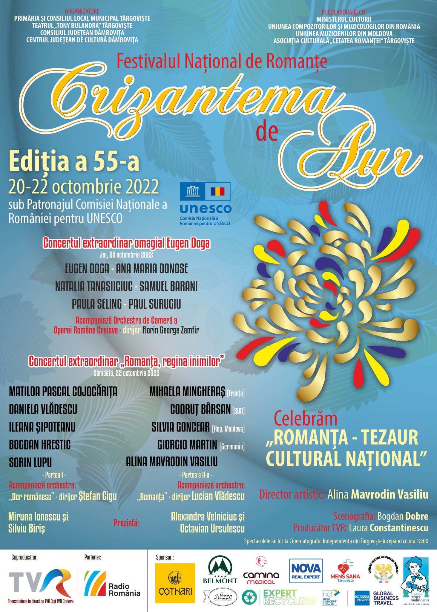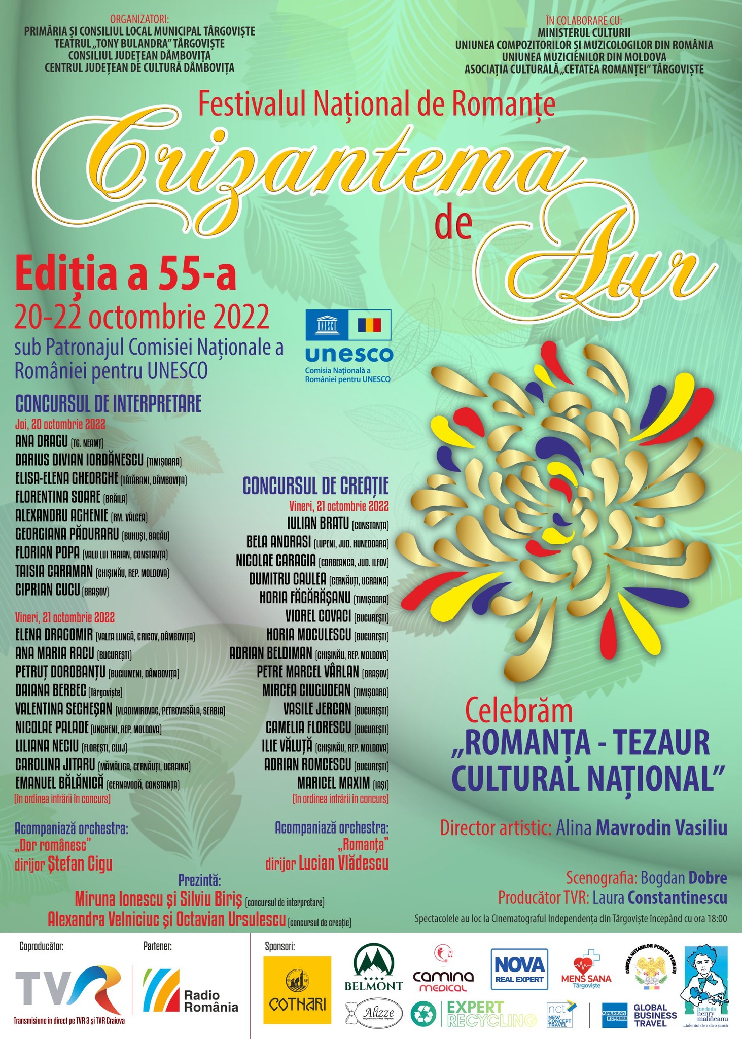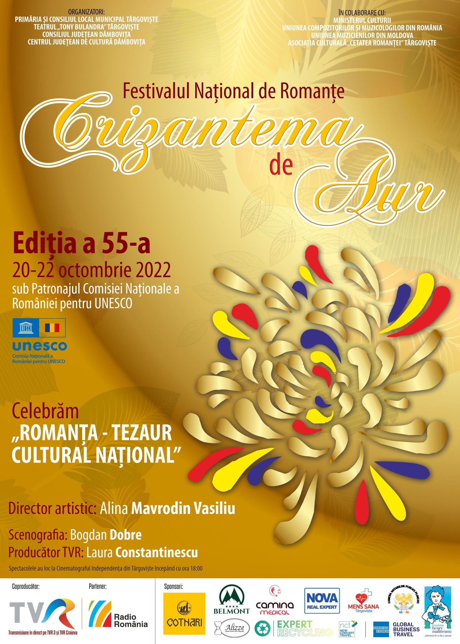 Vă facem cunoscut că, în perioada 20-22 octombrie 2022, se va desfăşura în municipiul Târgovişte, sub patronajul Comisiei Naţionale a României pentru UNESCO, cea de-a 55-a ediţie a Festivalului Naţional de Interpretare şi Creaţie a Romanţei „Crizantema de aur”, cel mai longeviv festival muzical din România, organizat neîntrerupt din anul 1968 la Târgoviște, cu scopul promovării Romanței ca gen muzical de patrimoniu al culturii naţionale.