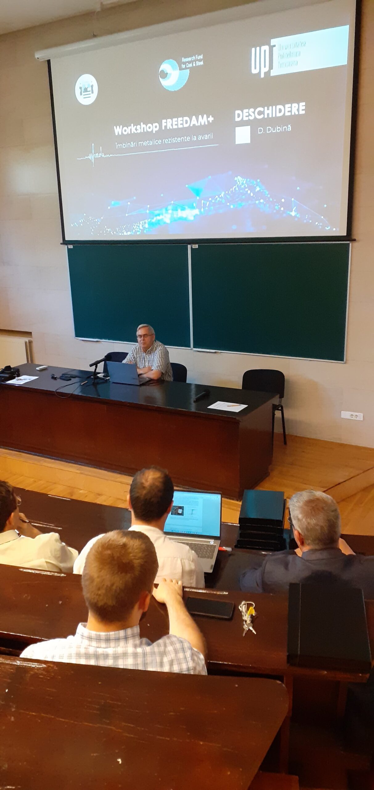 Evenimentul a fost deschis de acad. Dan Dubină, președintele Academiei Române, filiala Timișoara, și totodată, cadru didactic al Facultății de Construcții, care a subliniat că soluțiile elaborate, în timp, de Școala de Construcții Metalice de la Timișoara, cuprinse în publicațiile de specialitate din întreaga lume, au adus instituției recunoașterea internațională de care se bucură astăzi și au dus la selectarea acesteia pentru diseminarea și valorificarea proiectului de cercetare FREEDAM în rândul facultăților similare și a firmelor de construcții din România și Moldova.