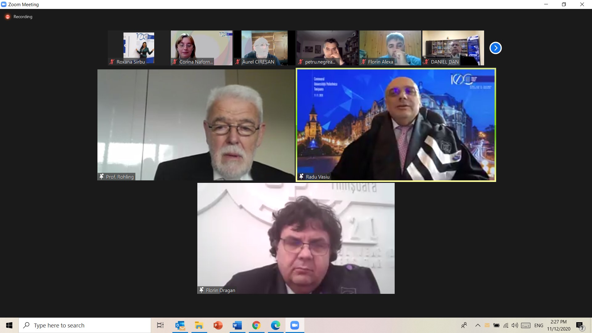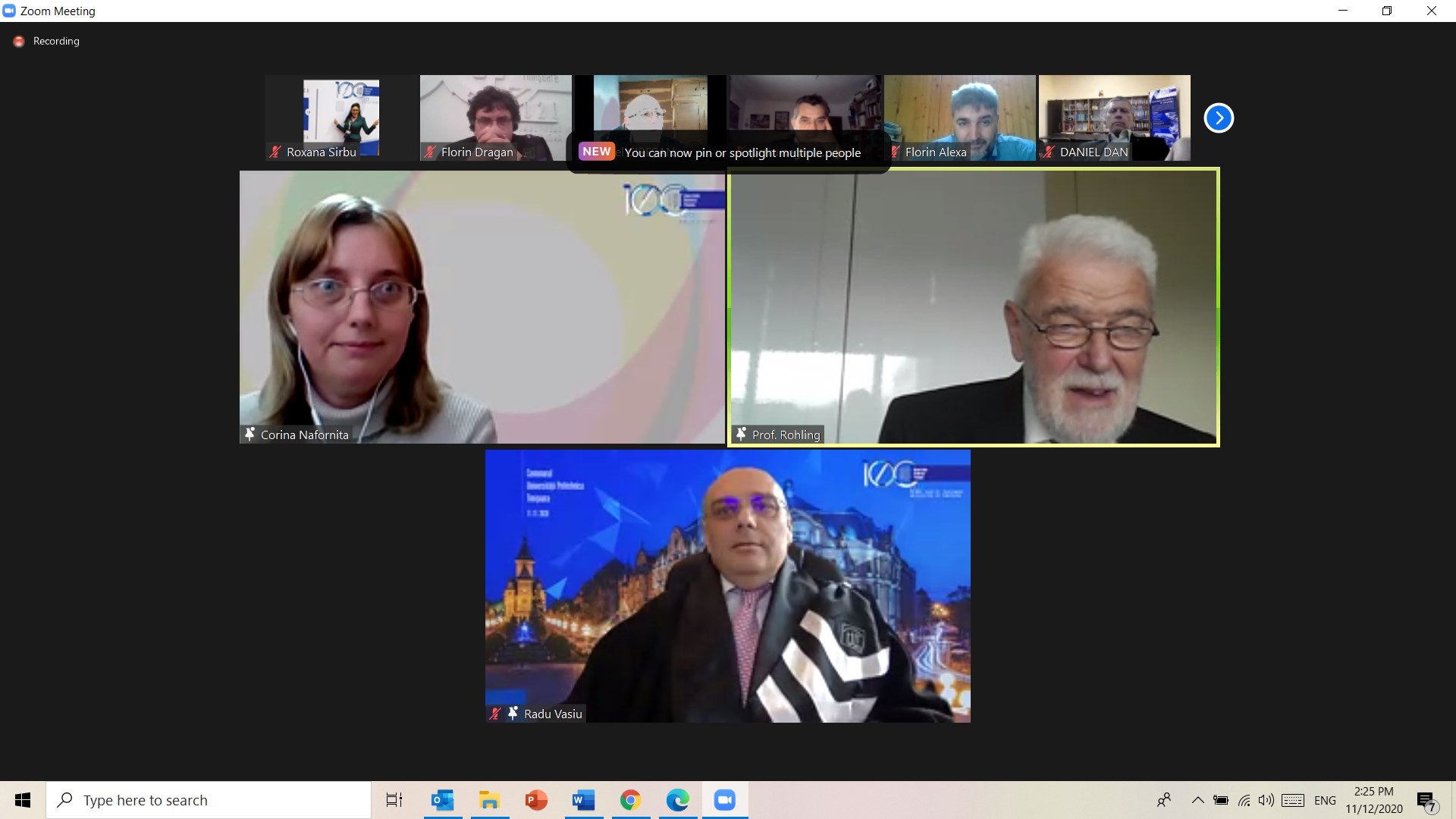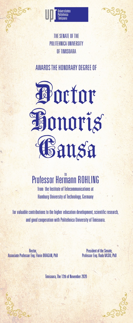 Senatul Universității Politehnica Timișoara s-a reunit, în ședință festivă în vederea decernării online a titlului academic de Doctor Honoris Causa domnului prof.dr.ing. Hermann Rohling, profesor la Universitatea Tehnică din Hamburg –Harburg, Germania și membru al Institutului German de Navigație, la propunerea Facultății de Electronică, Telecomunicații și Tehnologii Informaționale. În cadrul evenimentului, domnul profesor Hermann ROHLING a susținut prelegerea cu titlul „Autonomous driving based on radar sensors”.