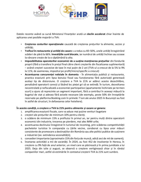 Printr-o scrisoare deschisă către Guvernul și Parlamentul României, Federatia Industriei Hoteliere din Romania face apel, alături de HORA și FPIOR, pentru un cadrul fiscal predictibil și echilibrat, singura soluție pentru buna funcționare a domeniului ospitalității și protejarea contribuțiilor esențiale la economia României.