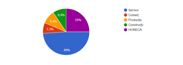 - În ceea ce privește domeniul de activitate al respondenților, 49% sunt din servicii, 25% aparțin HORECA, 9,4% sunt din producție, 9,4% sunt din construcții și restul de 7,3% sunt firme din comerț.