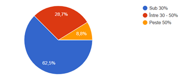 - Astfel, antreprenorii care au menționat că le-a fost impactată negativ activitatea ca urmare a modificărilor fiscale, au resimțit următoarele efecte asupra cifrei de afaceri: 62,5% sub 30%, 28,7% între 30-50% și 8,8% peste 50%.
