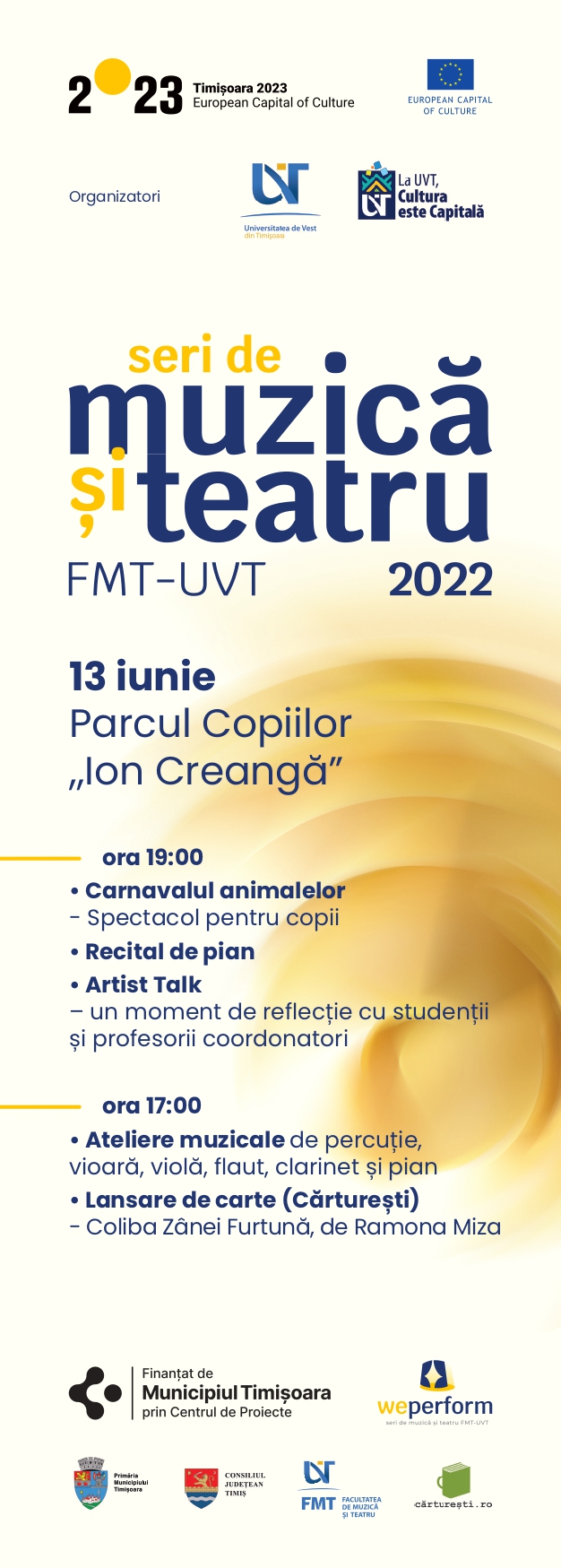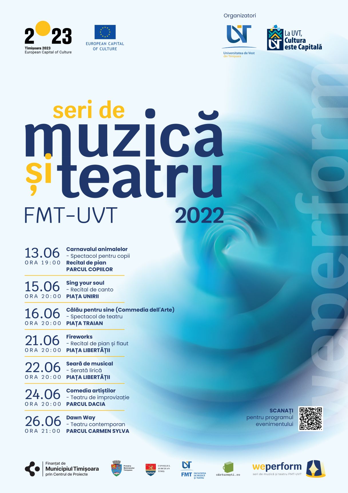 Următoarele evenimente din cadrul proiectului ,,La UVT, Cultura este Capitală!” cu titlul ,,WePerform – Seri de muzică și teatru” ediția a II-a, se vor desfășura în piețele centrale și în două parcuri din Timișoara, după cum urmează: