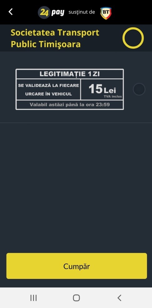 – pentru a putea utiliza această opțiune de achitare a călătoriei, trebuie descărcată aplicația 24pay din Google Play sau App Store, aplicație care, pentru a putea fi folosită necesită introducerea datelor unui card bancar (informație specificată pe banda superioară a afișului aplicat în diferite puncte de interes din oraș),