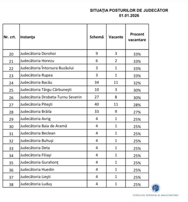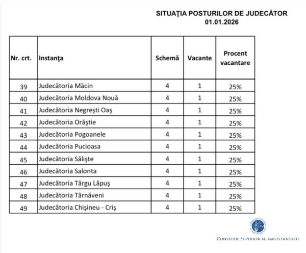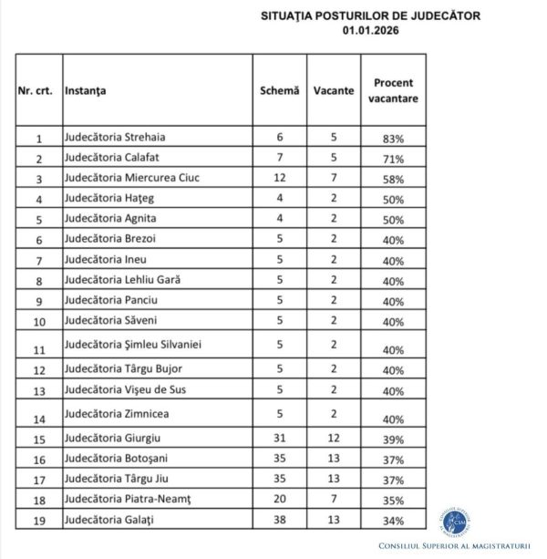 ”Secţia pentru judecători solicită Guvernului României să îşi asume măsuri legislative concrete pentru a crea cadrul legal necesar acoperirii deficitului de judecători, întrucât pentru buna funcţionare a societăţii româneşti este esențială eficientizarea activității instanțelor de judecată, prin prioritizarea componentei de resurse umane, consecinţele deficitului de personal asupra dreptului constituţional al cetăţenilor de acces la justiţie într-un termen rezonabil fiind directe şi grave” se arată în comunicatul de presă al Secţiei pentru judecători a Consiliului Superior al Magistraturii