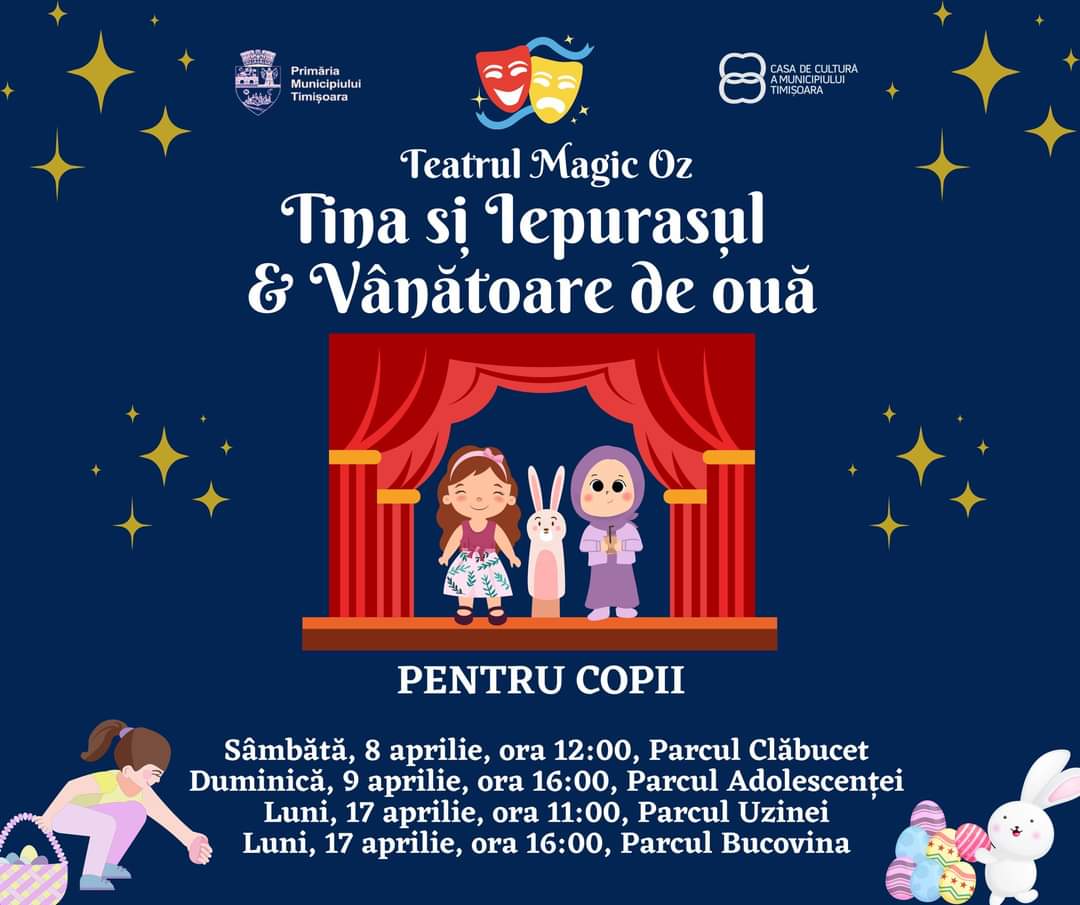 Ca în fiecare an, în parcurile din cartiere, copiii sunt așteptați la vânătoarea de ouă de ciocolată, precedată, în această primăvară, de spectacolul „Tina și Iepurașul”, prezentat de Teatrul Magic Oz.