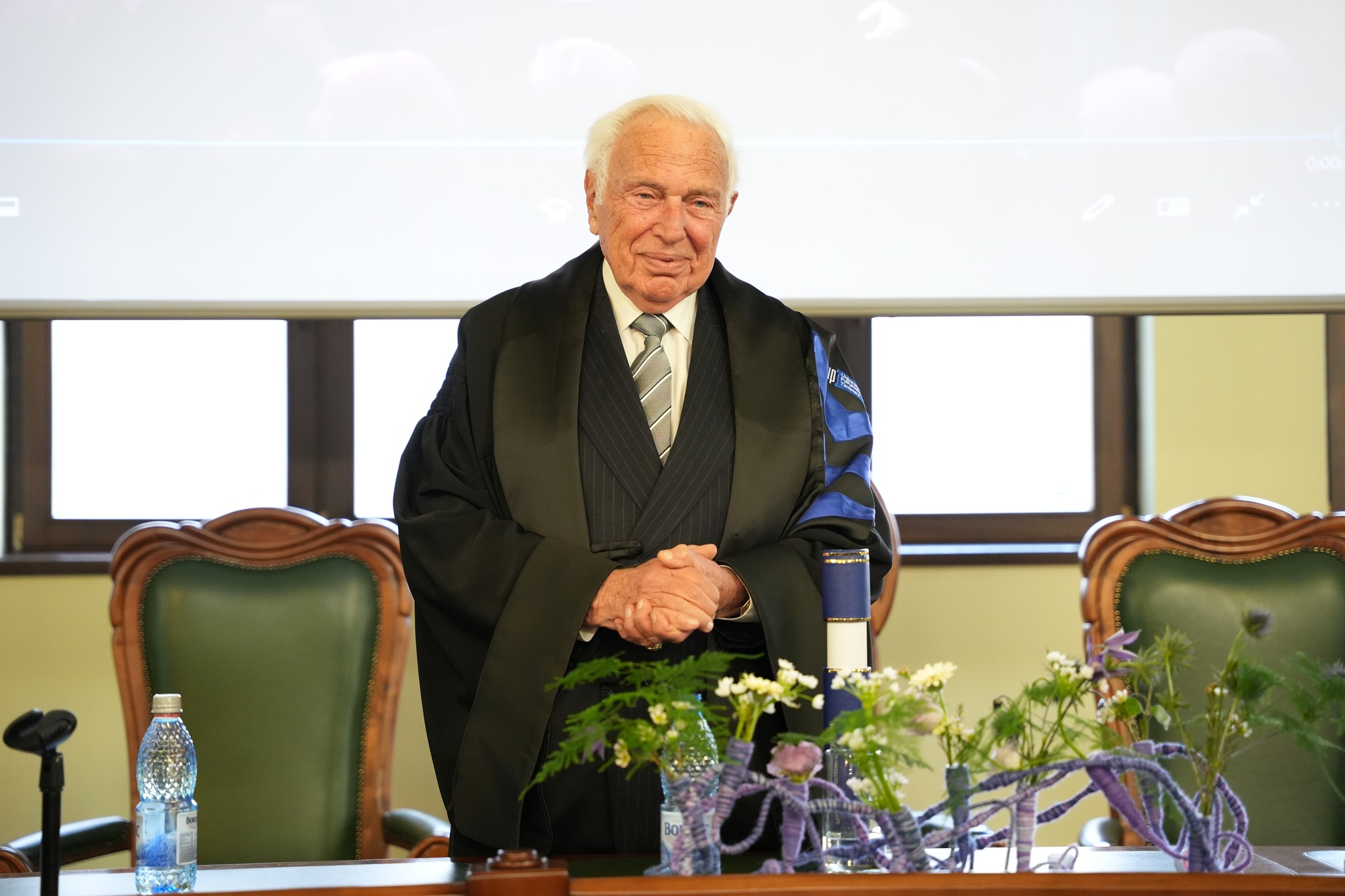 În continuare, Laudatio a fost citit de către prof.univ.dr.ing. Ștefan Kilyeni, un vechi prieten al maestrului, care a punctat principalele momente ale vieții și carierei lui Ioan Holender, o poveste demnă de un roman sau film.