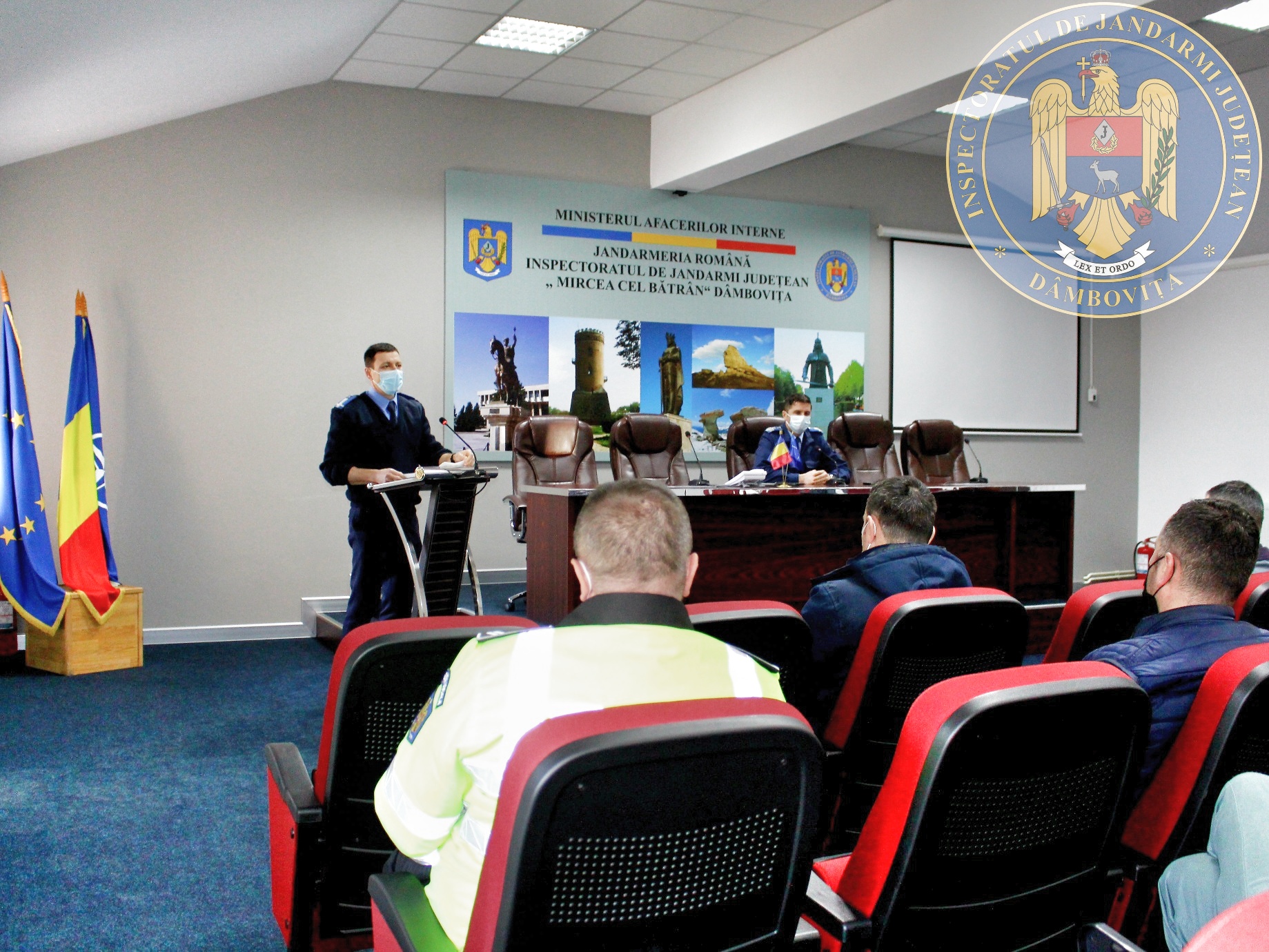 La sediul Inspectoratului de Jandarmi Judeţean Dâmboviţa a avut loc astăzi, 17 februarie a.c., o ședință între ofițeri ai unităţii cu atribuții în domeniul ordinii publice, reprezentanţi ai Inspectoratului de Poliţie Judeţean Dâmboviţa, Inspectoratului pentru Situaţii de Urgenţă “Basarab I” Dâmboviţa, Direcției Județene pentru Sport și Tineret Dâmbovița, structurilor de poliţie locală din Târgoviște, Moreni și Pucioasa, Asociaţiei Judeţene de Fotbal Dâmboviţa, ai cluburilor sportive care organizează manifestări sportive cu grad de risc, precum şi reprezentanţi ai societăţilor de protecţie şi pază cu atribuţii pe linia asigurării măsurilor de ordine şi siguranţă publică în incinta arenelor sportive de pe raza judeţului Dâmboviţa.