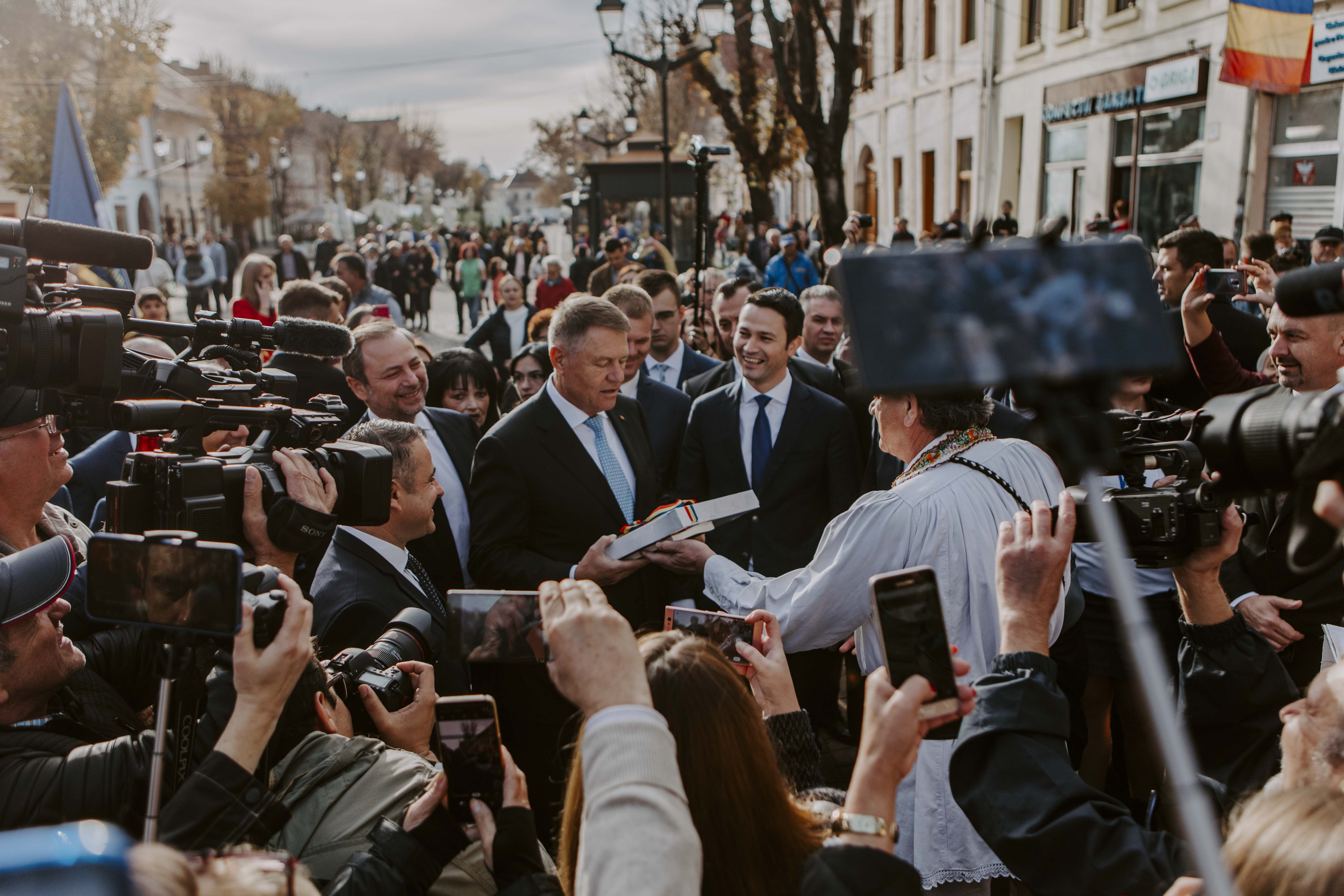 În fața sediului PNL, Iohannis a fost primit cu pâine și sare de un grup de femei și bărbați îmbrăcați în frumoasele costume populare din zonă. Președintele a primit cadou un ceas de perete. ”Am avut ca primar la Sibiu un slogan: <<pentru ca treaba să meargă ceas>>, vă doresc și vouă tot așa ceva”, a mulțumit președintele.