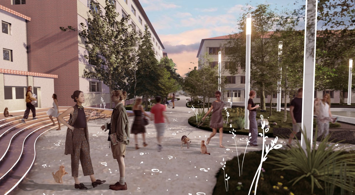 Proiectul de Peisagistică este gândit în relație cu proiectul de urbanism, în ideea de a transforma campusul într-un campus pentru sec. XXI (luând în considerare poziția centrală în oraș și conexiunile de care dispune pe toate direcțiile). Proiectul este privit ca un posibil vector de imagine pentru ceea ce ar putea să devină Campusul într-un viitor nu prea îndepărtat. Aleea Studenților, acolo unde sunt realizate propunerile, este de fapt „inima” Campusului și poate cel mai potrivit loc pentru a transmite spiritul UPT. Și în acest caz au rezultat trei soluții. Prima dintre acestea, „Parcul studenților”, oferă o soluție atentă la folosirea caracteristicilor existente, putând fi implementată total sau parțial. A doua propunere, „Schimbare – Meta Ballo”, propune o soluție atentă la componenta socială printr-o abordare ecologică, ludică și radicală. A treia propunere este „Continuitate” și propune o strategie intermediară ca scenariu, cu accent pe potențialul social al aleii.