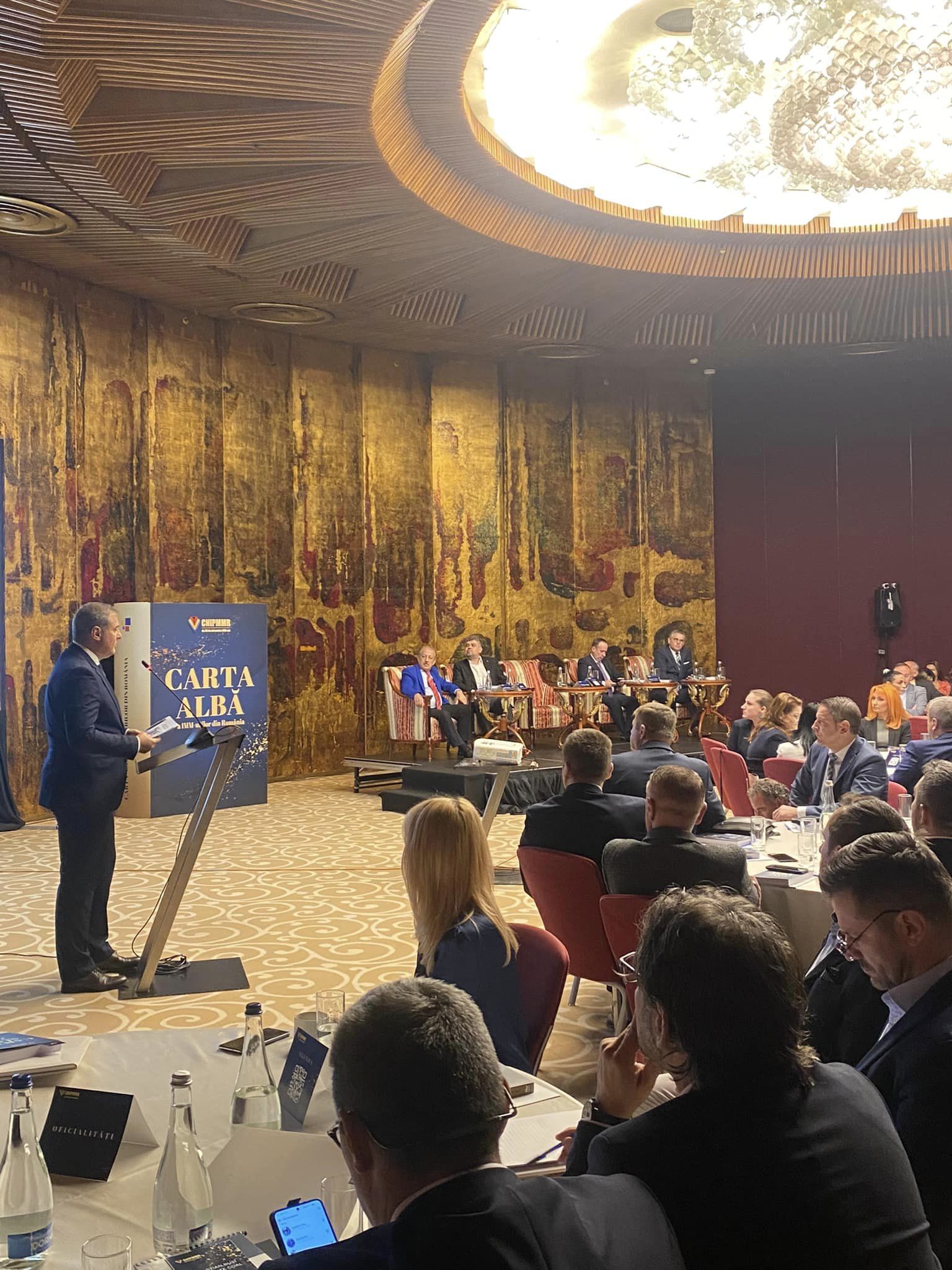 În cadrul evenimentului au avut intervenții domnul Florin JIANU, Președinte CNIPMMR, domnul Marcel CIOLACU, Președinte Camera Deputaților, domnul Adrian CÂCIU, Ministrul Finanțelor, prof. Univ. Dr. Ovidiu NICOLESCU, Președinte de Onoare al CNIPMMR și coordonator al, lucrării “Carta Albă a IMM-urilor din România 2022”