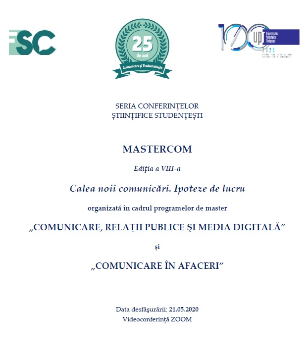 Joi, 21 mai 2020, a avut loc, bineînțeles online, sesiunea de comunicări științifice a studenților de la programele de master Comunicare, relații publice și media digitală, respectiv Comunicare în afaceri, gestionate de Facultatea de Științe ale Comunicării, eveniment aflat la a opta ediție, ce a avut loc sub genericul „Calea noii comunicări. Ipoteze de lucru”.