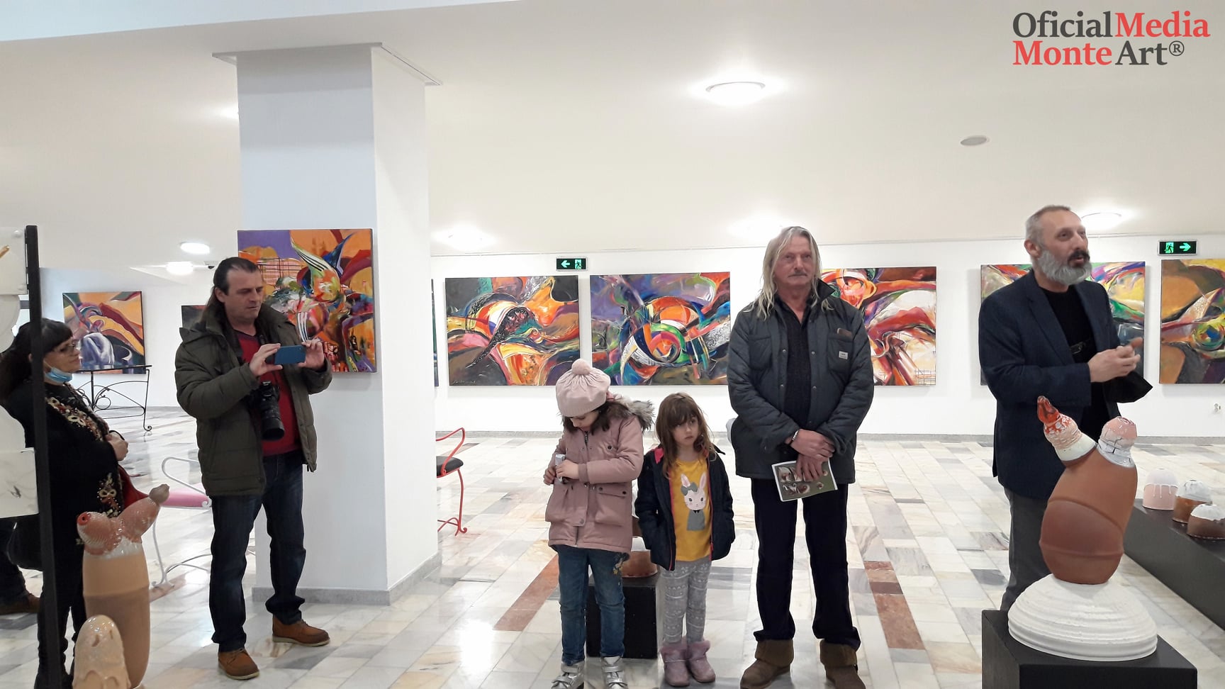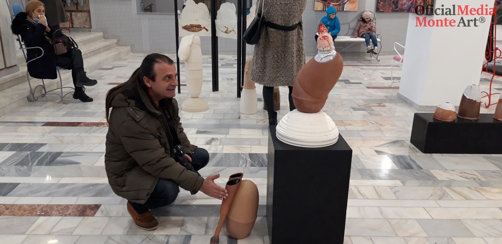 În centrul foaierului, Ovidiu Ionescu, parcă intenționat vorbește prin toate rotunjimile, despre atingere, într-o lume dementă în care ni s–a tot spus ”depărtați-vă social”. Ei iată că nu mai poți să nu-i mângâi ceramica, și cred că am fost surprins de papparazzi chiar când pipăiam piciorul doamnei. La Ovidiu lucrurile sunt clare, el creează doar pentru iubire. Dacă la Barbone, după cum spunea profesorul Mihai Șerbănescu, este loc și de război, la ceramica lui Ovidiu Ionescu, nu mai este nici timp nici loc de ceartă sau de întrebări. Aici nu există duplicitate, aici ai de-a face cu alegerea directă ”ce dorești, ce iei acasă”, care este mama, care este iubita, dar de ce nu, care este amanta. O îmbinare între forme, pământuri și ceruri, locul meu, locul tău și al nostru împreună, depinde până unde îți permiți să mergi cu visarea, căci atunci când ceramica lui nu inseamnă trup, inseamnă cuib, ineamnă acasă și liniște.