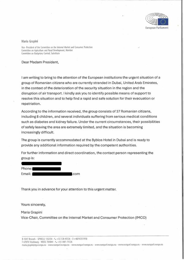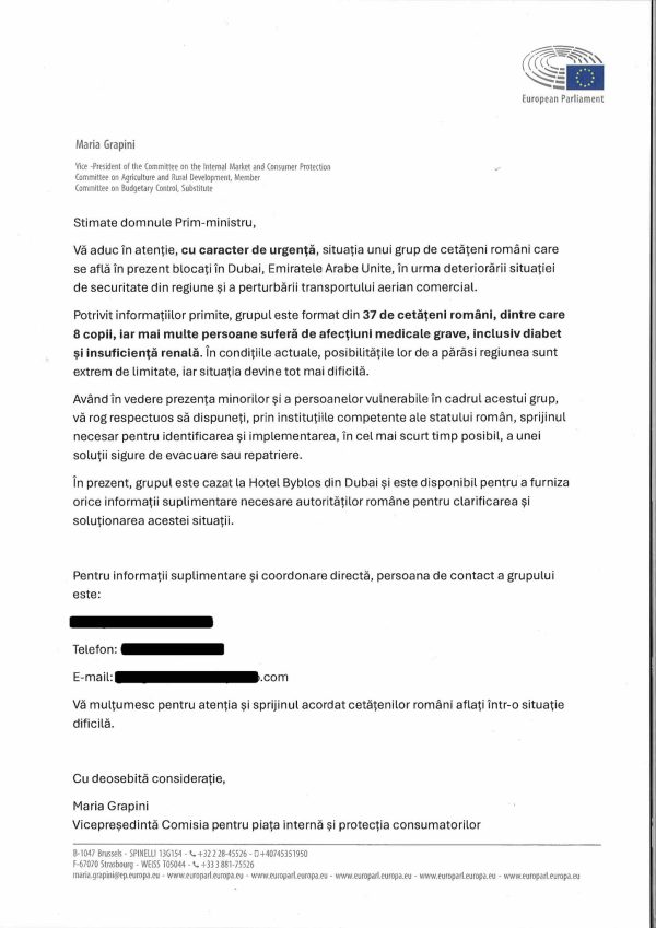 Concret, Maria Grapini le-a adus în atenție, cu caracter de urgență, celor doi oficiali, european respectiv român, situația unui grup de cetățeni români care se află, în prezent, blocați în Dubai, Emiratele Arabe Unite, în urma deteriorării situației de securitate din regiune și a perturbării transportului aerian comercial.