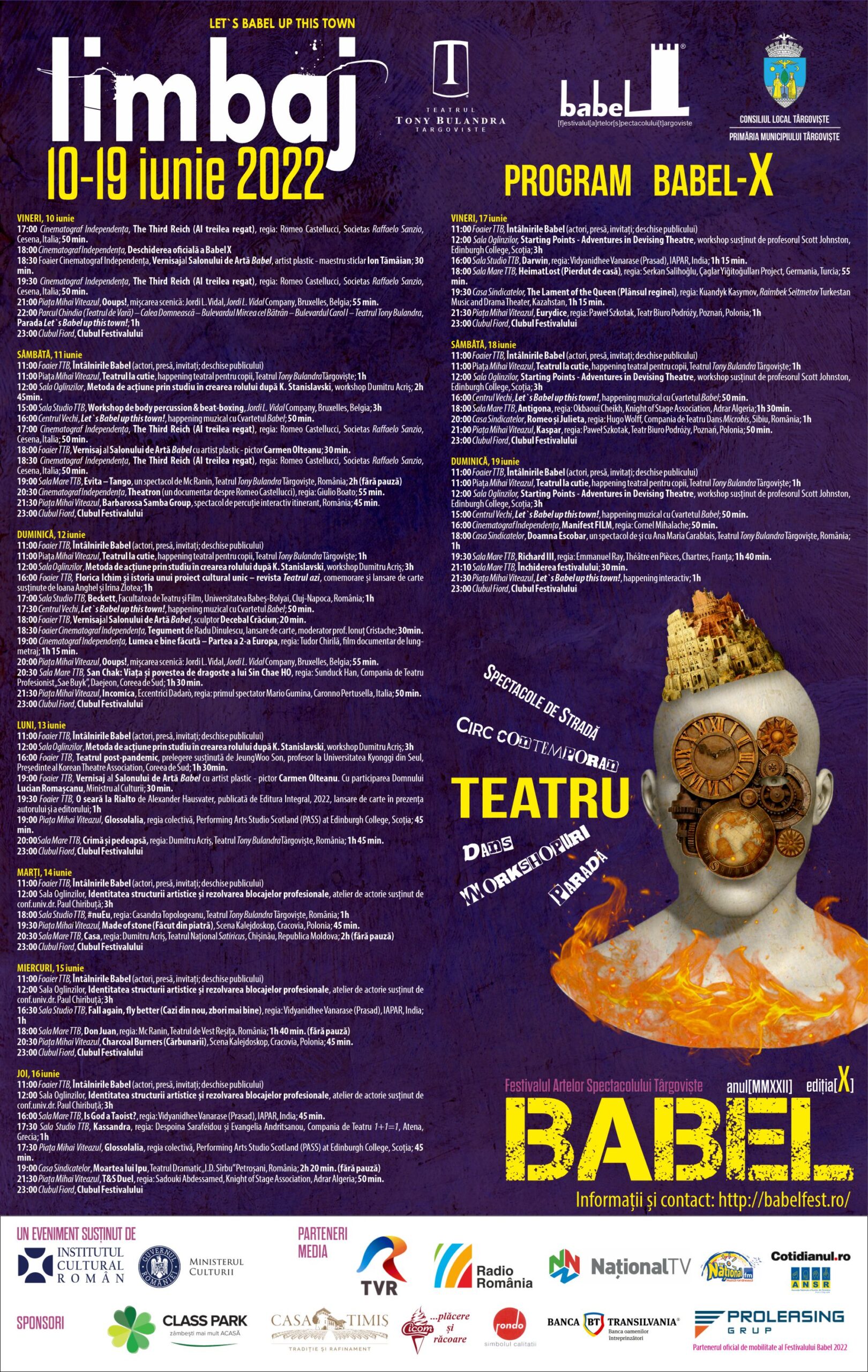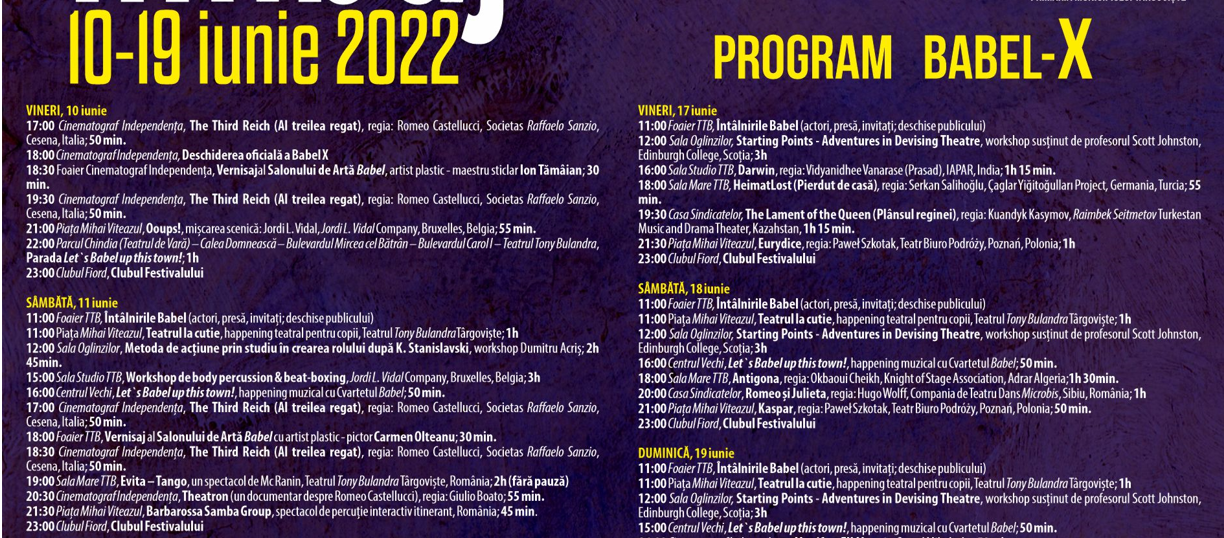 Colegii noștri din Sibiu (Compania Microbis – Casa de Cultură a Studenților), Reșița (Teatrul de Vest), Petroșani (Teatrul Dramatic „Ion D. Sîrbu) și, nu în ultimul rând, Chișinău (Teatrul Național Satiricus) vor fi prezenți în programul Babel 2022.