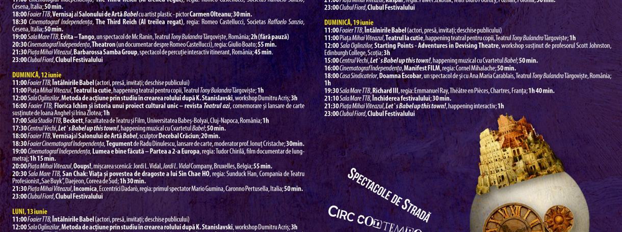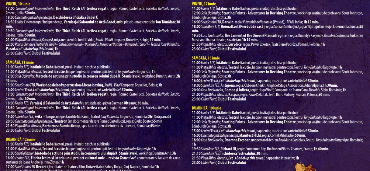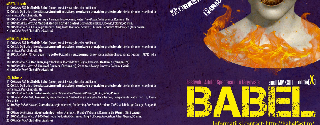 ”Pe această idee de teatru și educație, Festivalul Babel continuă cu workshopuri. O să încep cu asta pentru că avem 100 de voluntari, elevi din liceele din Târgoviște și workshopurile îi vor pregăti și pe actorii prezenți dar și pe elevi în ceea ce privește artele spectacolului, le vor deschide perspective, le vor arăta că ceea ce învață în școală poate fi aplicat în viață. Cei care conduc workshopurile sunt JeungWoo Son care este președintele Asociației Teatrelor din Coreea de Sud care a montat la noi Livada de vișini, Scott Johnston de la Facultatea de Teatru din Edinburgh, Scoția, îl cunoașteți, el lucrează foarte bine cu tinerii, Paul Chiribuță, actorul Paul Chiribuță, care a fost directorul școlii de teatru de la Limoges unde funcționa și marele regizor Silviu Purcărete. Se deschide cu o producție italiană, una dintre cele mai importante, de fapt în jurul acestei producții se orientează tot festivalul, este vorba de producția lui Romeo Castellucci. Vine pentru a doua oară în România, a mai fost cred invitat acum câțiva ani la Festivalul Național de Teatru, este unul dintre regizorii uriași ai lumii, dacă o să urmăriți pe internet o să vedeți că este un regizor lipsit de reverență față de autorități, față de biserică, este un regizor care lucrează cu bugete absolut colosale, nici nu se pune problema bugetului în ceea ce-l privește, el este Doctor Honoris Causa a mai multor universități din lume. S-au făcut proteste împotriva lui în Polonia, țară catolică, în Statele Unite. Este un regizor care schimbă lumea, schimbă oamenii și schimbă ideea despre teatru.”