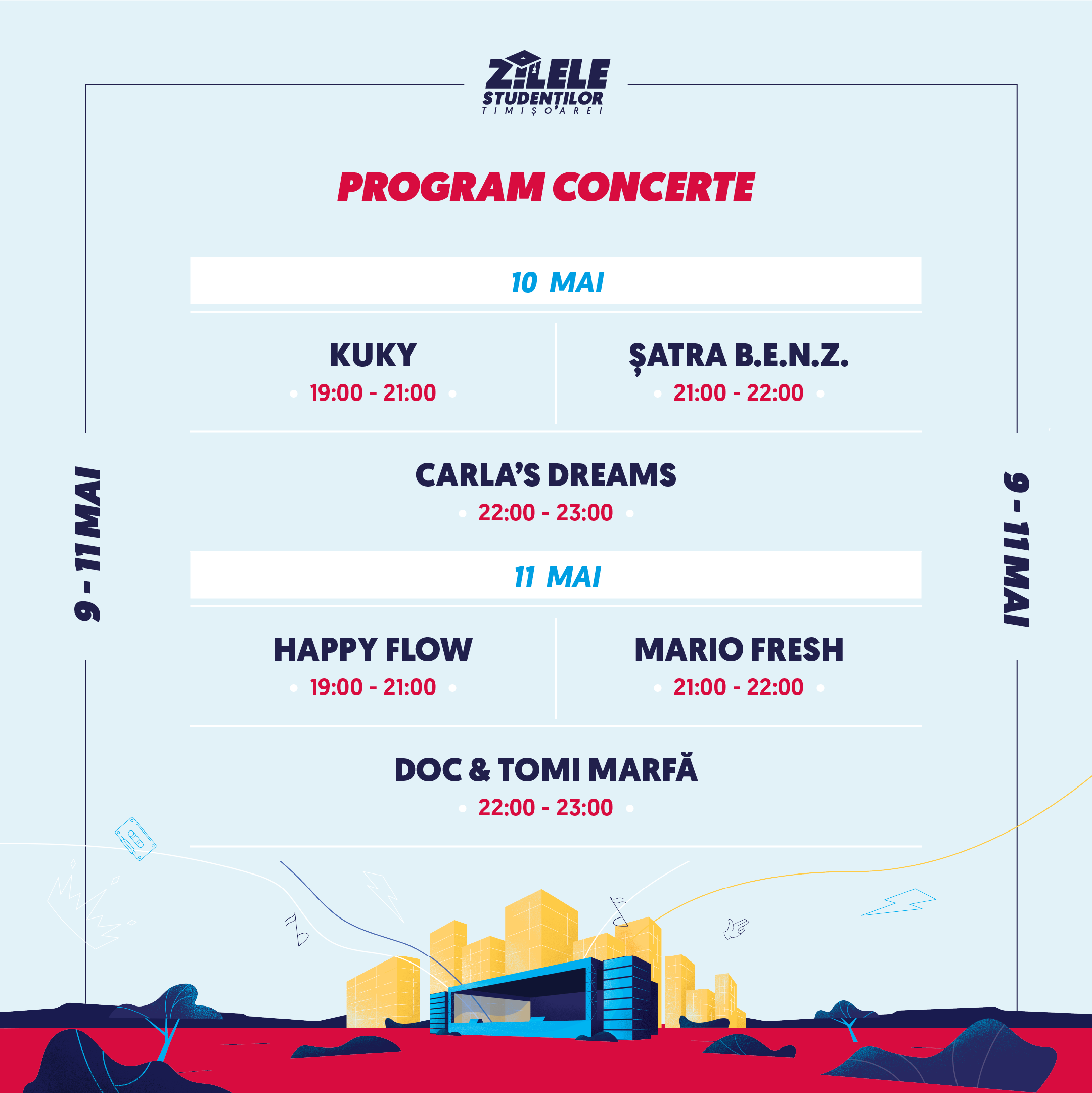 – 19:00 – 23:00 – Concerte – în parcarea dintre căminele C5 și C6 cu: KuKy | Satra B.E.N.Z. si Carla’s Dreams