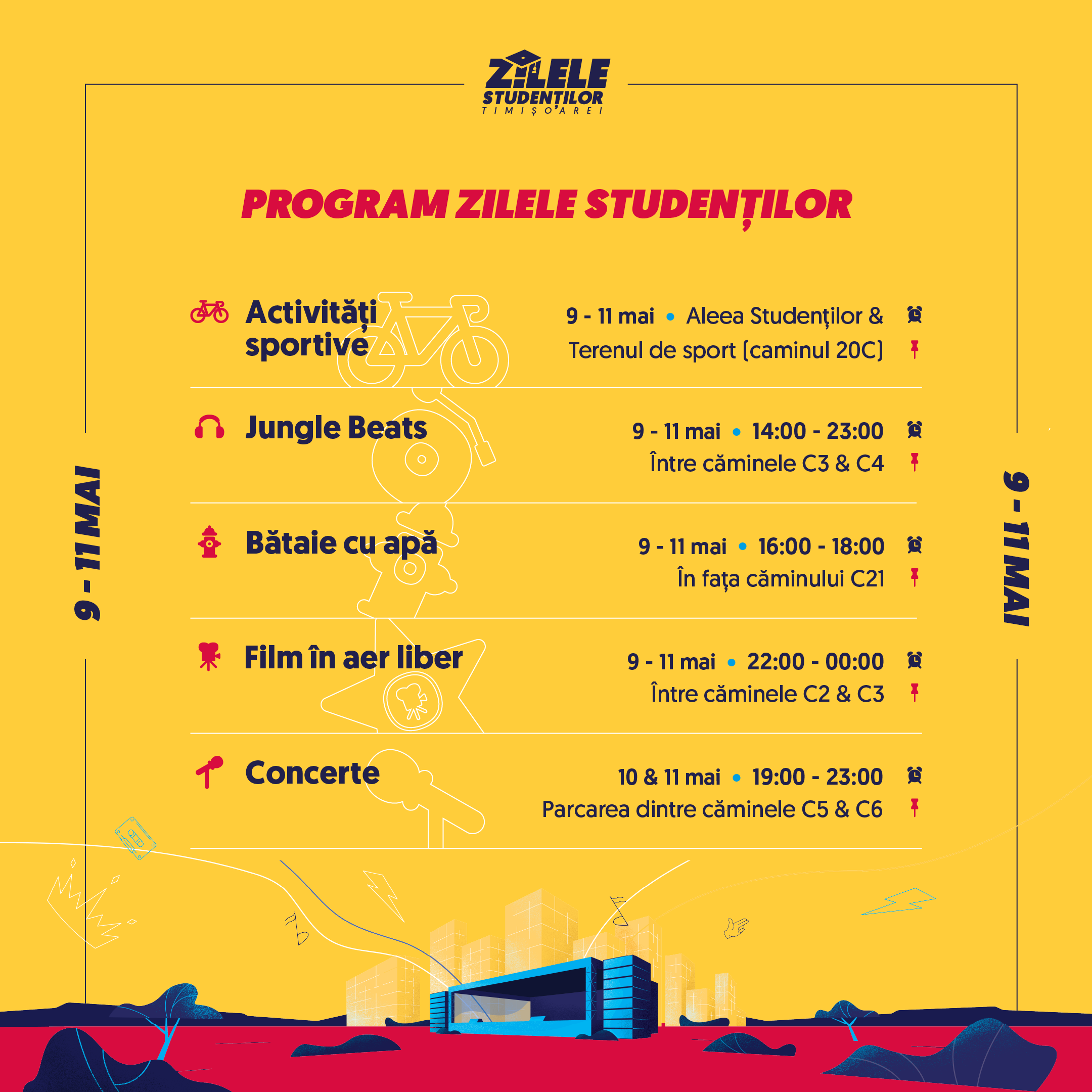 – 19:00 – 23:00 – Concerte – în parcarea dintre căminele C5 și C6 cu: Happy Flow | Mario Fresh si DOC