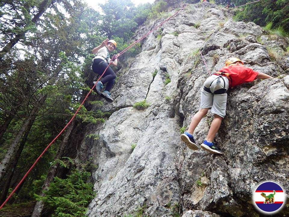 Ziua a patra (miercuri, 6 iulie) a permis tinerilor să-și arate curajul, dar și abilitatea, în atelierele de cățărare (desigur, asigurată!) și de rapel, desfășurate pe o mică stâncă din apropierea pensiunii Gură de Rai, locul unde am beneficiat de servicii de cazare și masă. După- amiaza a fost alocată unor jocuri în poiana de lângă pensiune sau unei ture rapide spre Cascada Burlacului, aflată în porțiunea finală a celebrelor chei ale Horoabei. A fost o zi care s-a încheiat cu amenajarea clasicului foc de tabără. După ora 21, gazdele au aprins o piramidă de lemne, iar tinerii au cântat la chitară cântece de munte, după ce „au ras” cele 5-6 platouri cu gogoși calde, cu dulceață de afine, aduse de personalul pensiunii.