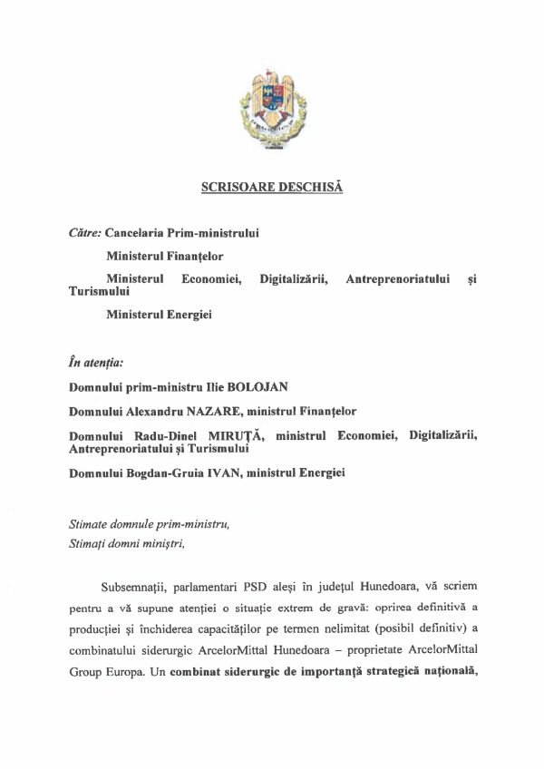 Parlamentarii PSD de Hunedoara Natalia Intotero, Cristian Resmeriţă şi Ilie Toma au semnat şi trimis o scrisoare deschisă premierului Ilie Bolojan, Ministrului de Finanţe – Alexandru Nazare, Ministrului Economiei Radu Dinel Miruţă şi Ministrului Energiei Bogdan Ivan, prin care, cer desecretizarea contractului de privatizare a SC Siderurgica SA şi demararea unui audit statutar privind respectarea contractului de privatizare.