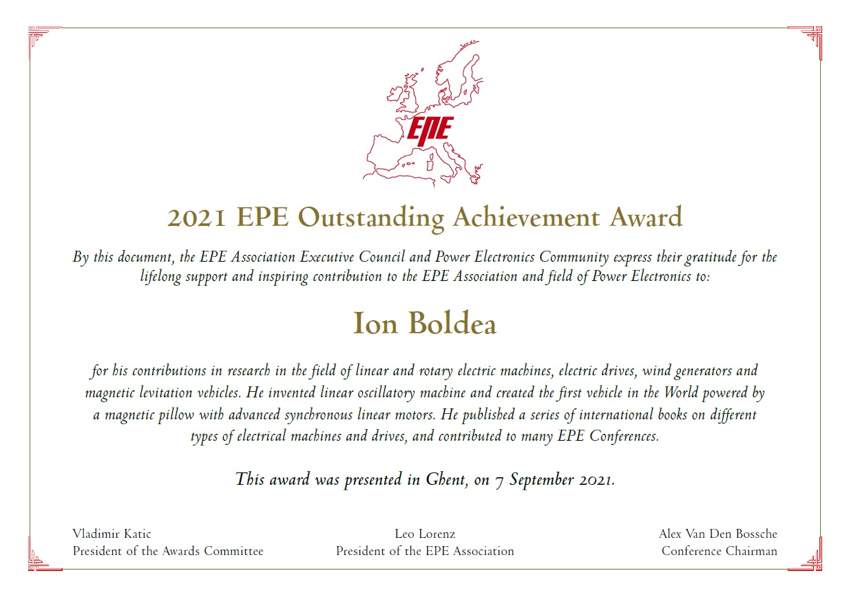 Unul dintre cei mai prolifici profesori ai Universității Politehnica Timișoara, academicianul Ion Boldea, a primit o nouă recunoaștere internațională, de această dată din partea Consiliului Executiv al Asociației EPE, în cadrul Conferinței EPE ECCE Europe, care a avut loc în prima parte a lunii septembrie, la Ghent, în Belgia. Academicianul Ion Boldea a primit, cu această ocazie, distincția „2021 EPE Outstanding Achievement Award”.
