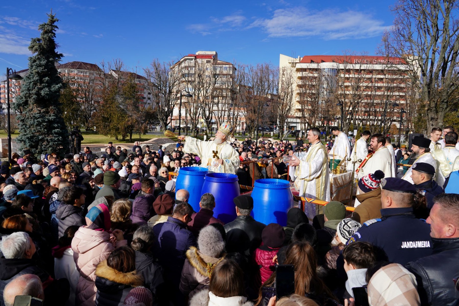 Cu prilejul sărbătorii Botezului Domnului, luni, 6 ianuarie 2025, Înaltpreasfințitul Părinte Arhiepiscop și Mitropolit Nifon, însoțit de un sobor de preoți și diaconi, din care a făcut parte Părintele Vicar Eparhial și Părintele Prorector al Universității ”Valahia”, a săvârșit Sfânta Liturghie la Catedrala din Târgoviște. Apoi, pe platoul din fața Catedralei, Părintele Mitropolit Nifon a oficiat slujba Agheasmei celei Mari, în prezența a numeroși credincioși, care au fost binecuvântați cu apă sfințită și au primit-o în dar, în sticle special pregătite.