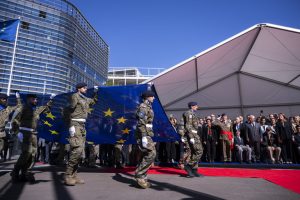 Înaintea evenimentului în plen, președinții Roberta Metsola și Antonio Costa au participat la o ceremonie de ridicare a drapelului și depuneri de coroane în afara clădirii Parlamentului din Strasbourg.