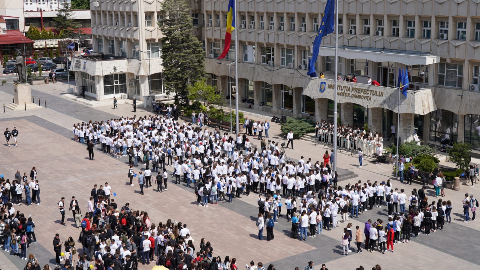 O mie de elevi din mai multe unități de învățământ târgoviștene au participat astăzi, 9 mai, în Piața Tricolorului din municipiul Târgoviște, la flashmob-ul organizat de Consiliul Județean Dâmbovița, prin Centrul Județean de Cultură.