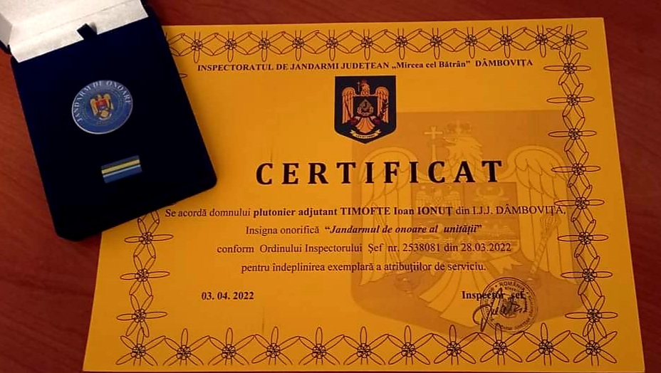 Titlul i-a fost acordat într-un cadru oficial de către colonel Matei Viorel, inspector șef al Inspectoratului de Jandarmi Județean Dâmbovița, care i-a înmânat jandarmului montan certificatul și Insigna onorifică pentru îndeplinirea exemplară a atribuțiilor de serviciu.