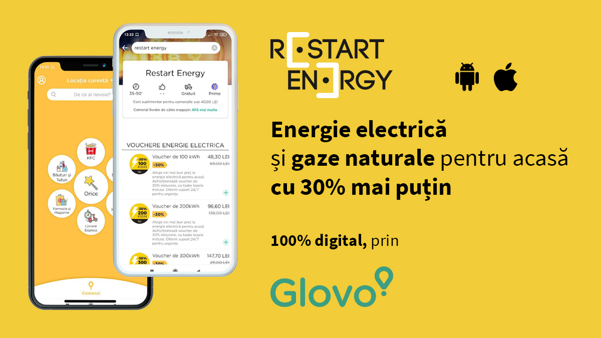 Restart Energy pune la dispoziția consumatorilor din România, prin intermediul aplicației Glovo, în promoție limitată, 500 de vouchere valorice de energie electrică, de 100 kWh, 200 kWh, 300 kWh și 500 kWh, și 500 de vouchere valorice de gaze naturale, de 500 kWh, 1 MWhși 5 MWh, care pot fi achiziționate rapid  și ușor, fără birocrație și cu 30% mai ieftin, având toate taxele incluse.