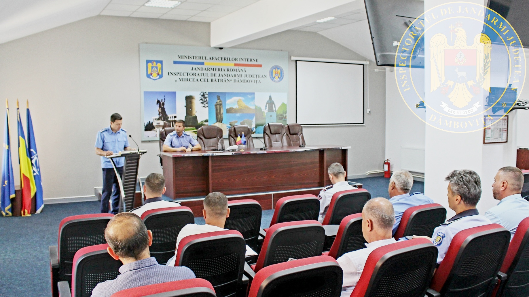 La sediul Inspectoratului de Jandarmi Judeţean Dâmboviţa a avut loc joi, 21iulie a.c., o ședință comună între ofițeri ai unităţii cu atribuții în domeniul ordinii și siguranței publice, reprezentanţi ai Inspectoratului de Poliţie Judeţean Dâmboviţa, Inspectoratului pentru Situaţii de Urgenţă “Basarab I” Dâmboviţa, structurilor de poliţie locală din Târgoviște, Moreni și Pucioasa, ai cluburilor sportive care organizează manifestări sportive cu grad de risc, precum şi reprezentanţi ai societăţilor de protecţie şi pază cu atribuţii pe linia asigurării măsurilor de ordine şi siguranţă publică în incinta arenelor sportive de pe raza judeţului Dâmboviţa.