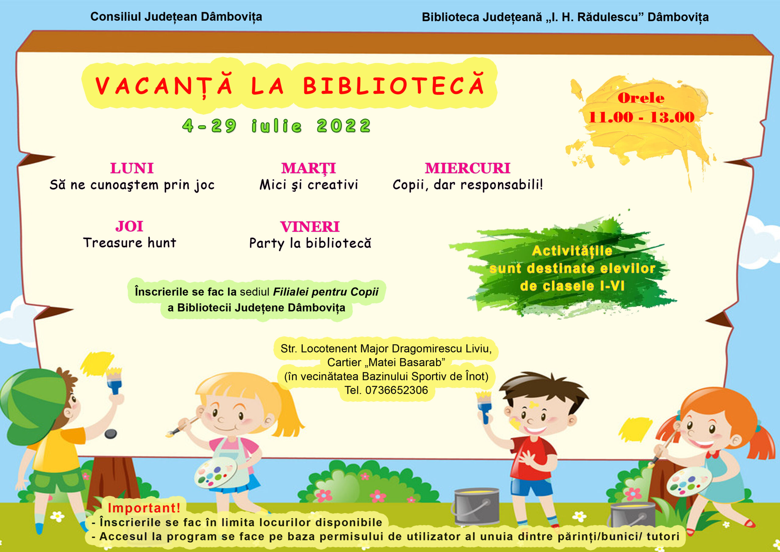 În perioada 4-29 iulie 2022, intervalul orar 1100-1300, la Filiala pentru Copii a Bibliotecii Judeţene Dâmboviţa se va desfăşura ediţia a XIV-a a programului „Vacanţă la bibliotecă”.