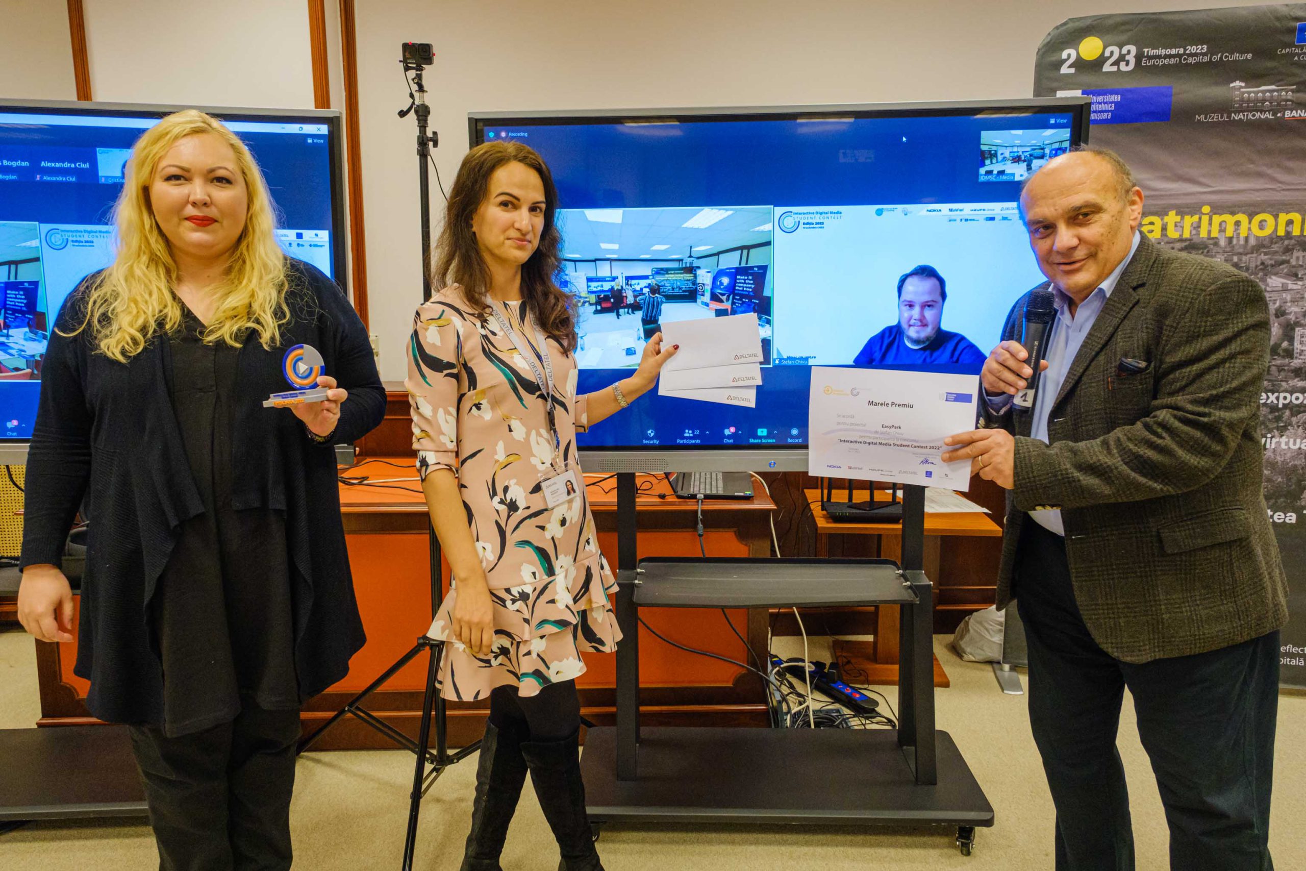 • Marele premiu IDMSC 2022, oferit de către compania Deltatel, împreună cu trofeul IDMSC printat 3D de către compania Nutechnologies a fost acordat studentului Ștefan Chivu de la Facultatea de Automatică și Calculatoare, Universitatea Politehnica Timișoara, pentru proiectul EasyPark – o aplicație mobilă folosită pentru a ușura găsirea unui loc de parcare în zonele publice aglomerate, prin prelucrarea informațiilor preluate de la o rețea de senzori amplasați în teren;