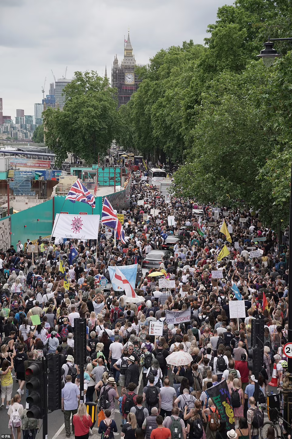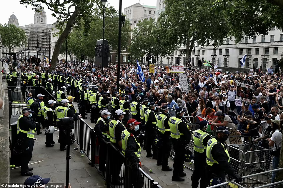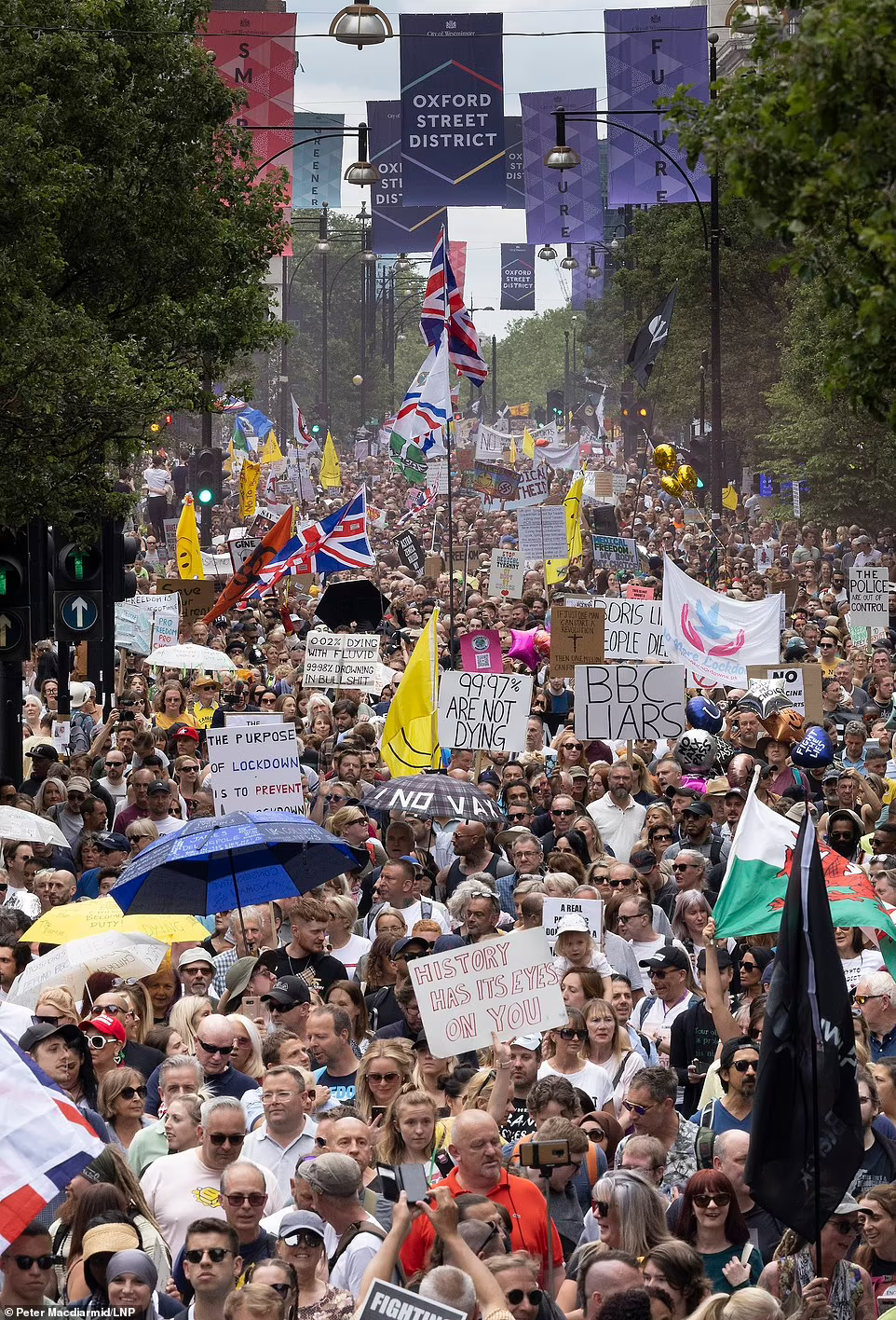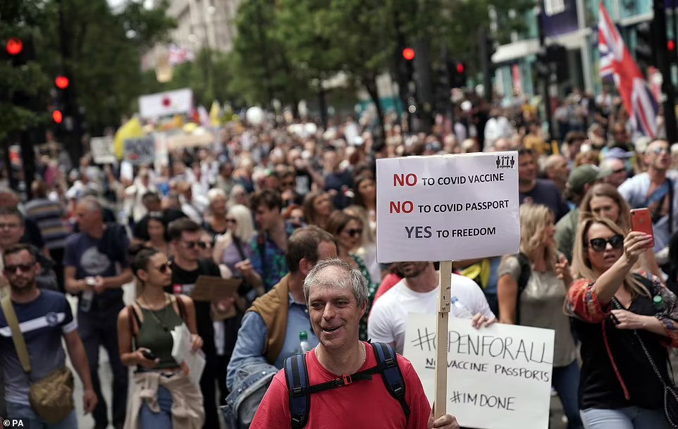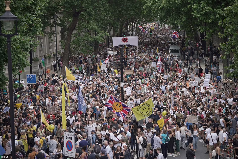 Zeci de mii de protestatari au mărșăluit prin Oxford Street, Regent Street, Hyde Park și Northumberland Avenue în timp ce țineau pancarte pe care scria „varianta Boris”, „nu la vaccinul Covid” și „nu la pașaportul Covid”.