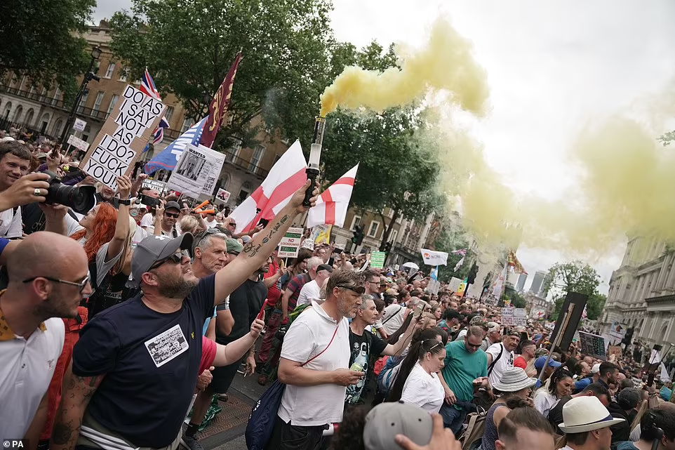 Tobe, fluierături și scandări se auzeau la o anumită distanță în jur, în timp ce steagurile zburau deasupra mulțimilor în timp ce treceau prin centrul Londrei.