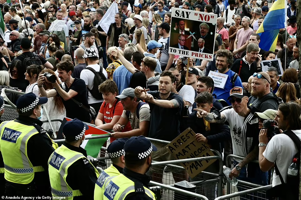 Zeci de mii de protestatari anti-lockdown au ieșit ieri pe străzile Londrei, în cea mai mare demonstrație de până acum – cu înscrisuri care cereau „arestarea lui Matt Hancock”. Secretarul pentru sănătate a fost acuzat de ipocrizie, în legătură cu un videoclip care îl arăta în timp ce își săruta asistenta căsătorită – Gina Coladangelo, dar pentru restul britanicilor predica restricțiile draconice pro covid, scrie dailymail.co.uk