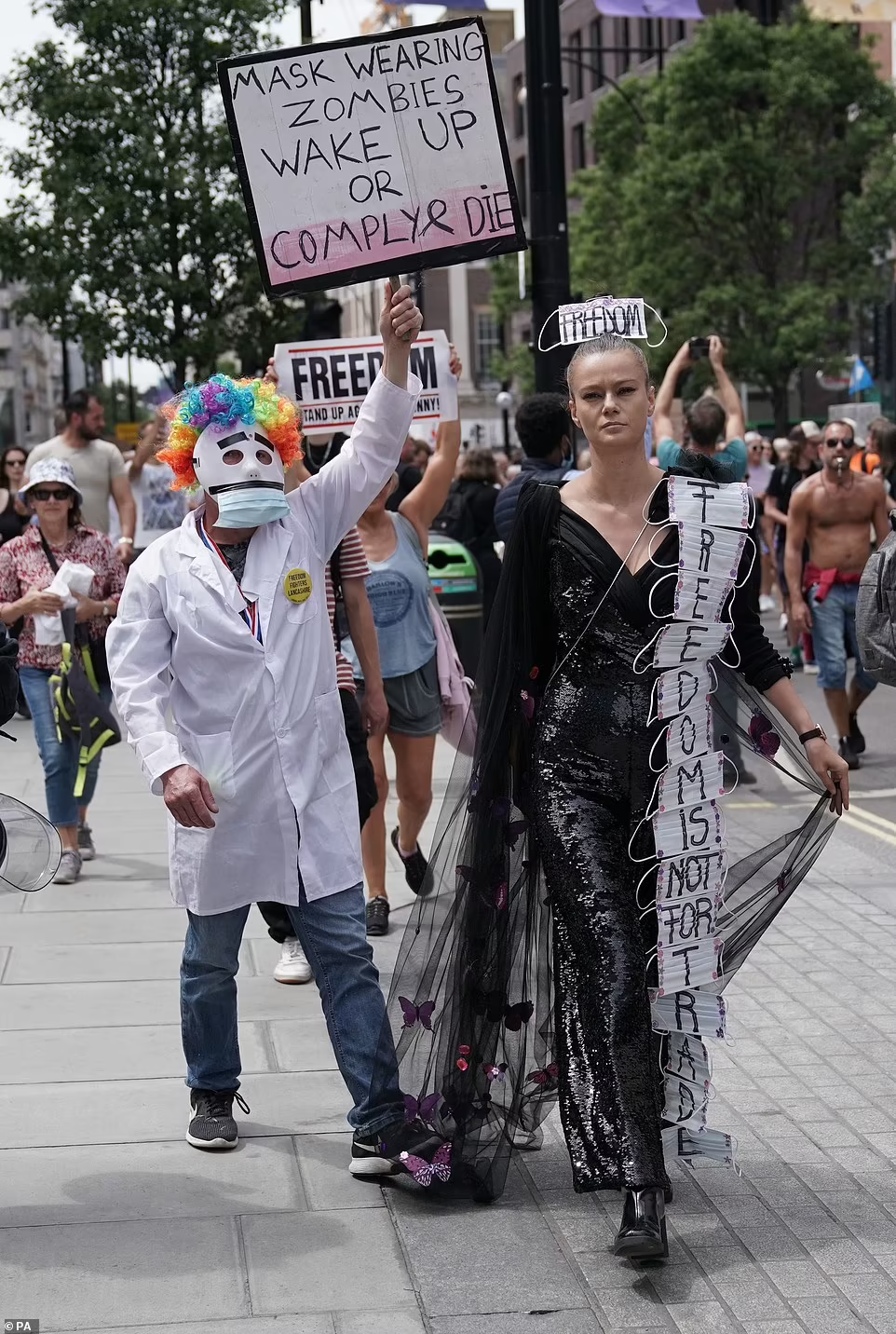 Oamenii dețineau pancarte pe care scria „libertatea nu este pentru comerț”, „masca o porți dacă ești zombi” ”trezește-te sau conformează-te și mori”.