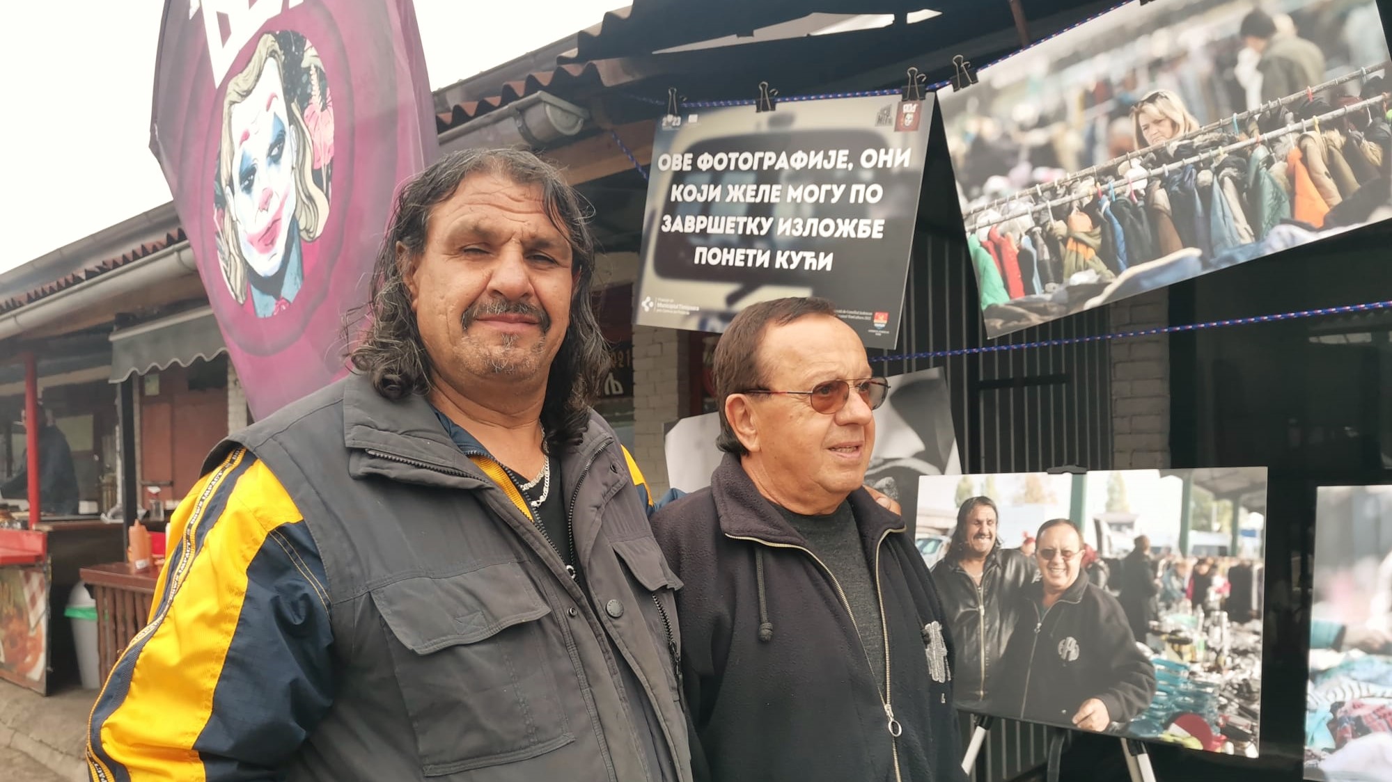 Pijaca (Piața Nailon), Novi Sad, Serbia cu o expoziție foto integrată între tarabe cu fotografii