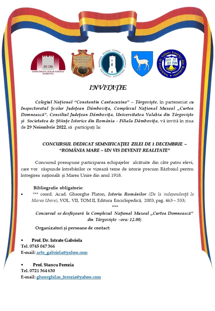 Marți, 29 noiembrie 2022, ora 12:00, va avea loc la Muzeul de Istorie, concursul dedicat semnificației zilei de 1 Decembrie – „România Mare – un vis devenit realitate”.