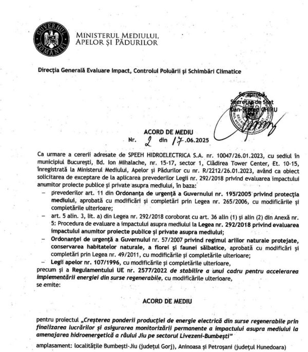 Demersul vine în contextul în care, Asociația Bankwatch România a contestat în instanță acordul de mediu emis la începutul anului, document care permitea reluarea lucrărilor la acest obiectiv energetic, major pentru județele Gorj și Hunedoara. Finalizarea hidrocentralelor Bumbești–Livezeni este o datorie strategică și morală.