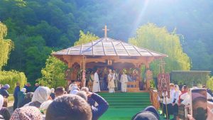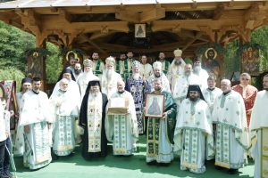 Sfânta și Dumnezeiasca Liturghie a fost oficiată de un sobor de ierarhi, preoți și diaconi, sub protia Înaltpreasfințitului Părinte Mitropolit Irineu la altarul de vară al mănăstirii.