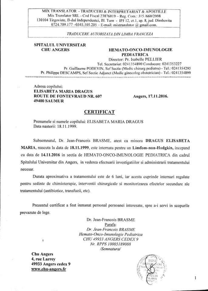Am primit ajutor si copilul a fost acceptat la un spital universitar din Franta, unde coloana cervicala care era distrusa de boala, putea fi recontruita cu un polimer special printr-o interventie chirurgicala.