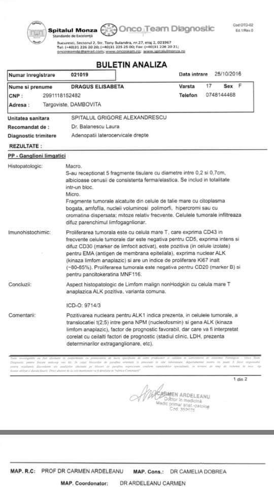 In data de 11 noiembrie am primit diagnosticul de la laborator: Limfom malign nonHodgkin, mai exact cancer limfatic.