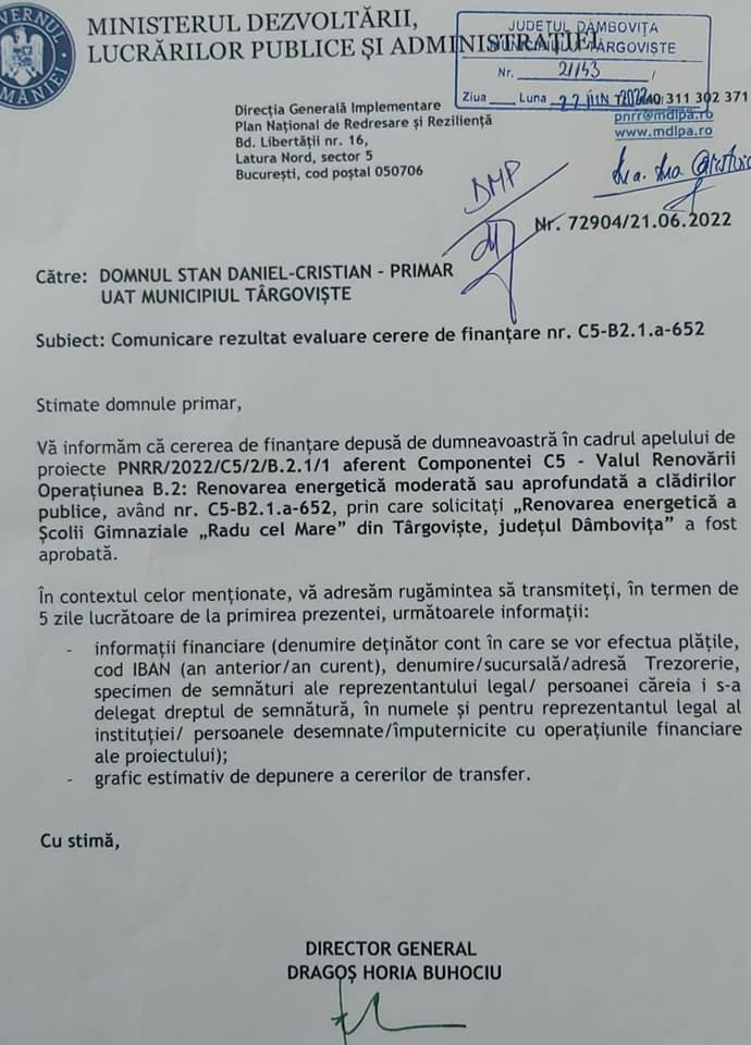 ”La finalul săptămânii trecute, am primit rezultatul evaluării cererii de finanțare depuse de către Primăria Târgoviște în cadrul Planului național de redresare și reziliență, apelul de proiecte PNRR/2022/C5/2/B.2.1/1, componenta 5 – Valul renovării, operațiunea B.2: ”Renovarea energetică moderată sau aprofundată a clădirilor publice”.