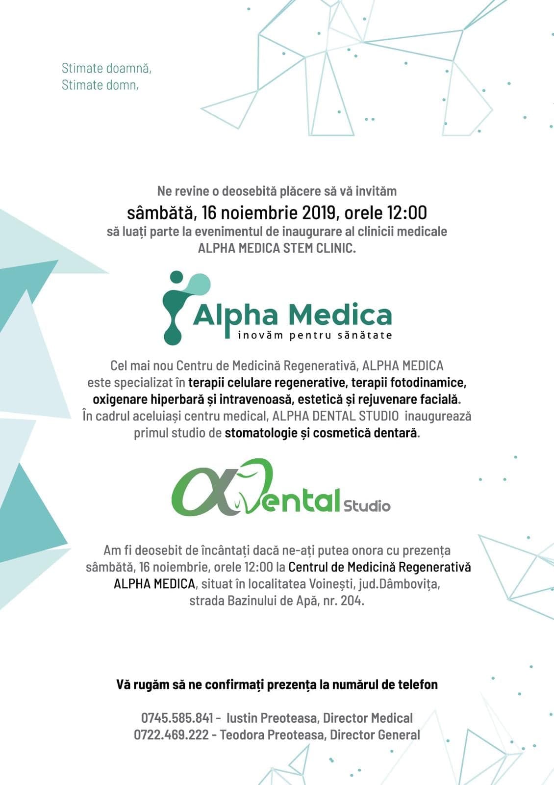 Sâmbătă, 16 noiembrie 2019, ora 12.00, sunteti invitați la evenimentul de inaugurare al clinicii medicale ALPHA MEDICA STEM CLINIC, cel mai nou Centru de Medicină Regenerativă.