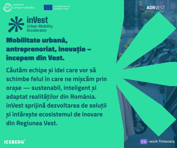 2 iunie 2025Vestul României se pregătește să devină un pol al inovației urbane odată cu lansarea inVest – Urban Mobility Accelerator. Este primul accelerator din România dedicat exclusiv soluțiilor de mobilitate urbană, care devine realitate printr-un program finanțat de EIT Urban Mobility, alături de Agenția pentru Dezvoltare Regională VestADR Vest, și implementat de Iceberg Plus și Cowork Timișoara.