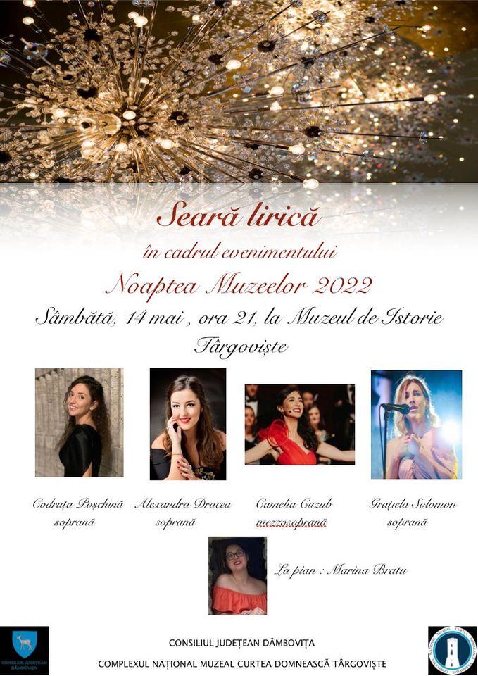 Consiliul Județean Dâmbovița, prin Complexul Național Muzeal „Curtea Domnească” Târgoviște, vă invită la o seară lirică, sâmbătă, 14 mai 2022, începând cu ora 21:00, în cadrul evenimentului „Noaptea Muzeelor”.