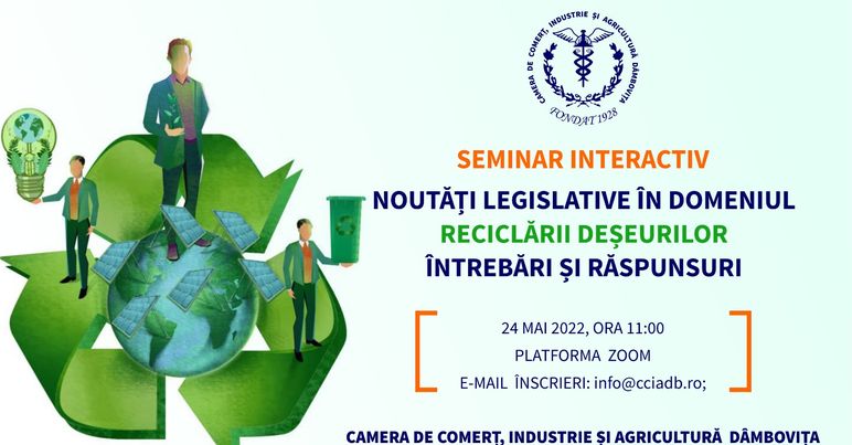 Camera de Comerț, Industrie și Agricultură Dâmbovița te invită pe 24 mai 2022, ora 11:00 pe platforma ZOOM, la seminarul online NOUTĂȚI LEGISLATIVE ÎN DOMENIUL RECICLĂRII DEȘEURILOR – ÎNTREBĂRI ȘI RĂSPUNSURI – SEMINAR INTERACTIV