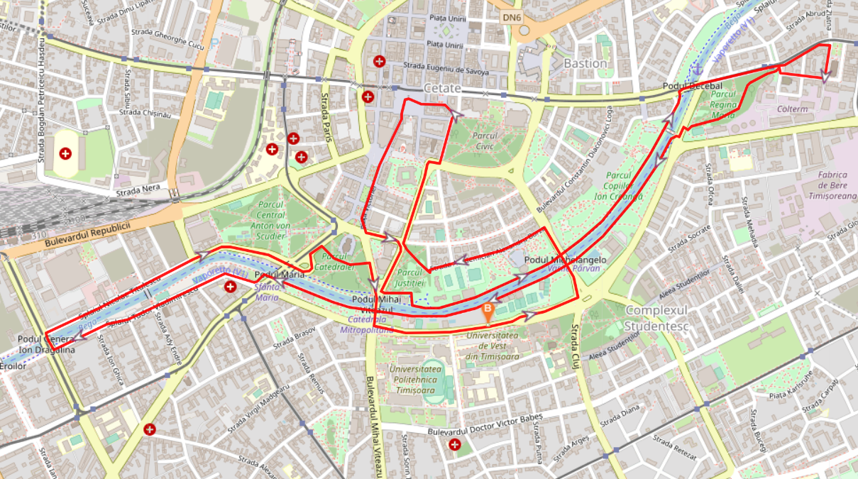START UVT > Bd. V. Pârvan > la stânga pe str. Michelangelo (banda 1, contrasens) > la stânga pe str. Acad. A. Borza > prin Parcul Justiției > la dreapta pe str. 20 Decembrie 1989 > Piața I. Huniade > str. C. Telbisz (pe pista de biciclete) > la stânga pe str. E. Caruso > str. General Praporgescu > Piața Libertății > la stânga pe str. Alba Iulia > Piața Victoriei (partea estică) > la stânga pe Bd. C.D. Loga > la dreapta pe str. 20 Decembrie 1989 > la stânga pe Splaiul Spiru Haret > mal drept Bega > pe sub Podul Michelangelo > la dreapta pe Podul Decebal (trotuar) > Bd. 3 August 1919 (trotuar) > la dreapta Piața Romanilor (trotuar) > la dreapta str. I.L. Caragiale > la dreapta str. Episcop I. Lonovich > prin Parcul Regina Maria > la stânga Splaiul Nistrului > mal stâng Bega > pe sub Podul Michelangelo > pe sub Podul M. Viteazu > pe sub Podul Maria > Splaiul T. Vladimirescu (trotuar) > la dreapta Pod General I. Dragalina (trotuar) > la dreapta Splaiul N. Titulescu (trotuar) > după intersecția cu str. Jiul: Splaiul N. Titulescu > pe sub Podul Maria > la dreapta pe Bd. 16 Decembrie 1989 (trotuar) > prin Parcul Catedralei > la dreapta pe Bd. Regele Ferdinand I > Podul M. Viteazu > la stânga pe Bd. V. Pârvan > UVT FINISH.