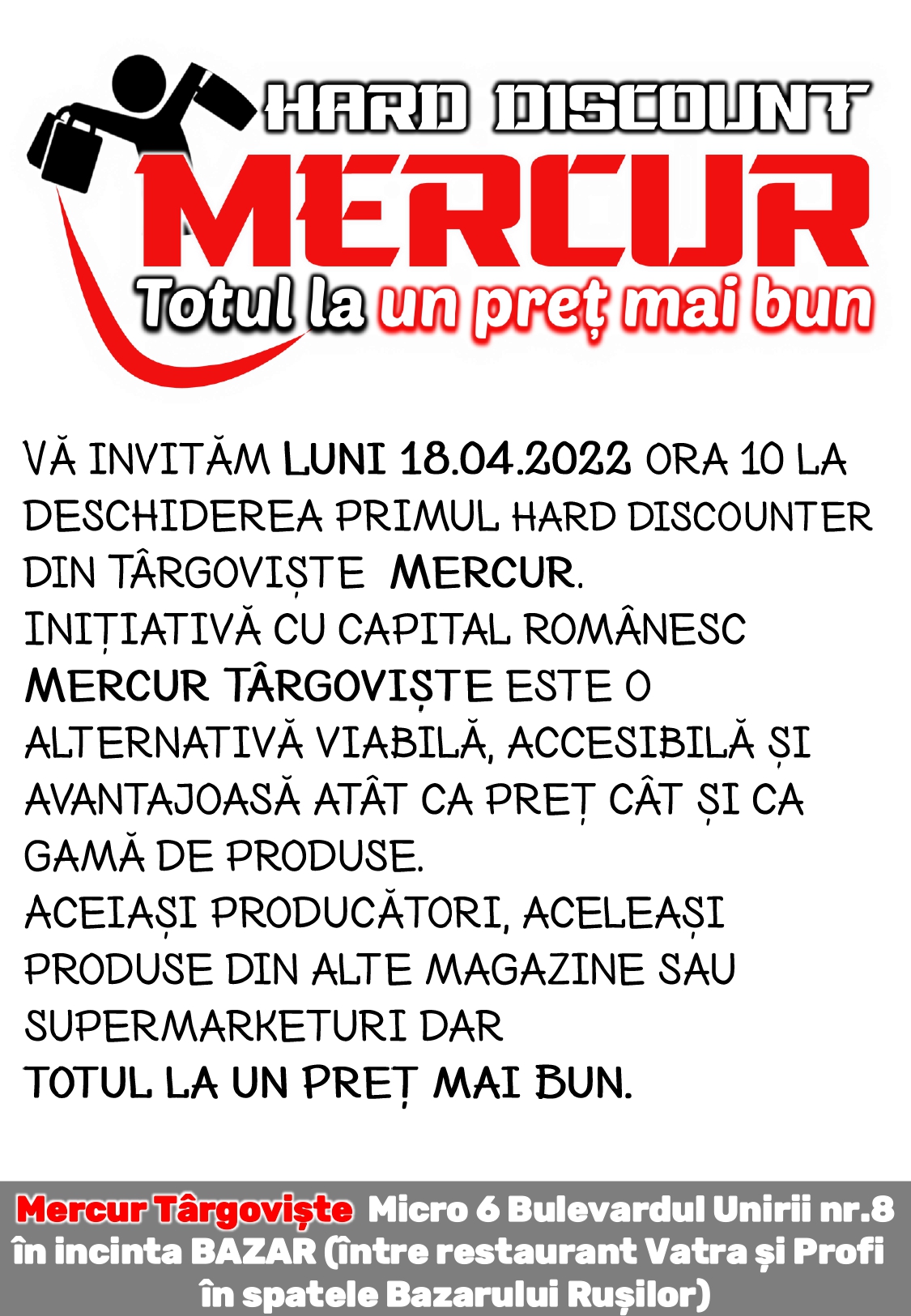Luni, 18 aprilie 2022, de la ora 10 va avea loc deschiderea primului hard discounter din Târgoviște, ”Mercur”.